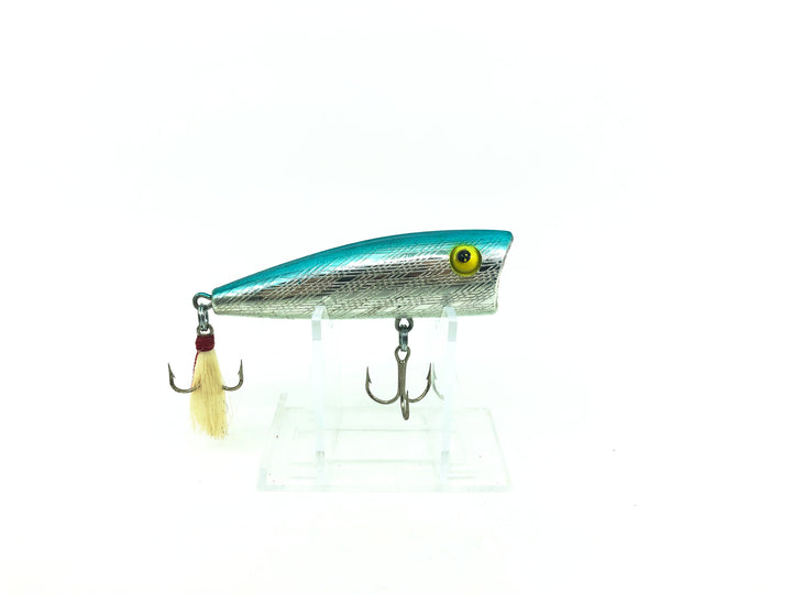 Rebel Magnum Pop-R Silver/Blue Back Color. This large pop-r is about 3" long. Lure is in good condition with some minor wear. Great lure that provides plenty of action. See photos.
