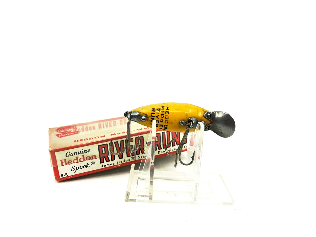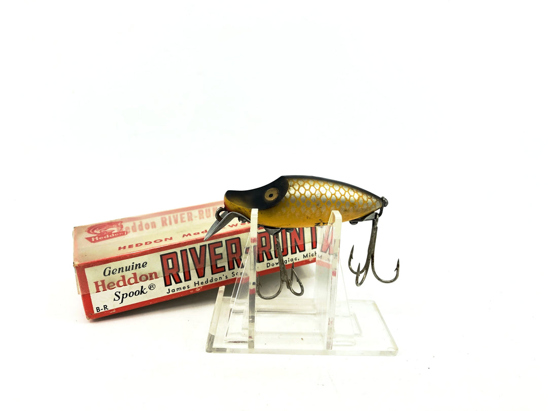 Heddon Midget River Runt Spook PG Golden Shiner Color with Box - Plastic Top Box. About 2 1/2" long. Used lure in overall good condition. Box in nice condition as well. Box dates from 1955-1962. No code stamping on box end. Nice combo overall. See photos. One of the most iconic fishing lures of all time. Collect or fish you can't go wrong with a Heddon River Runt.