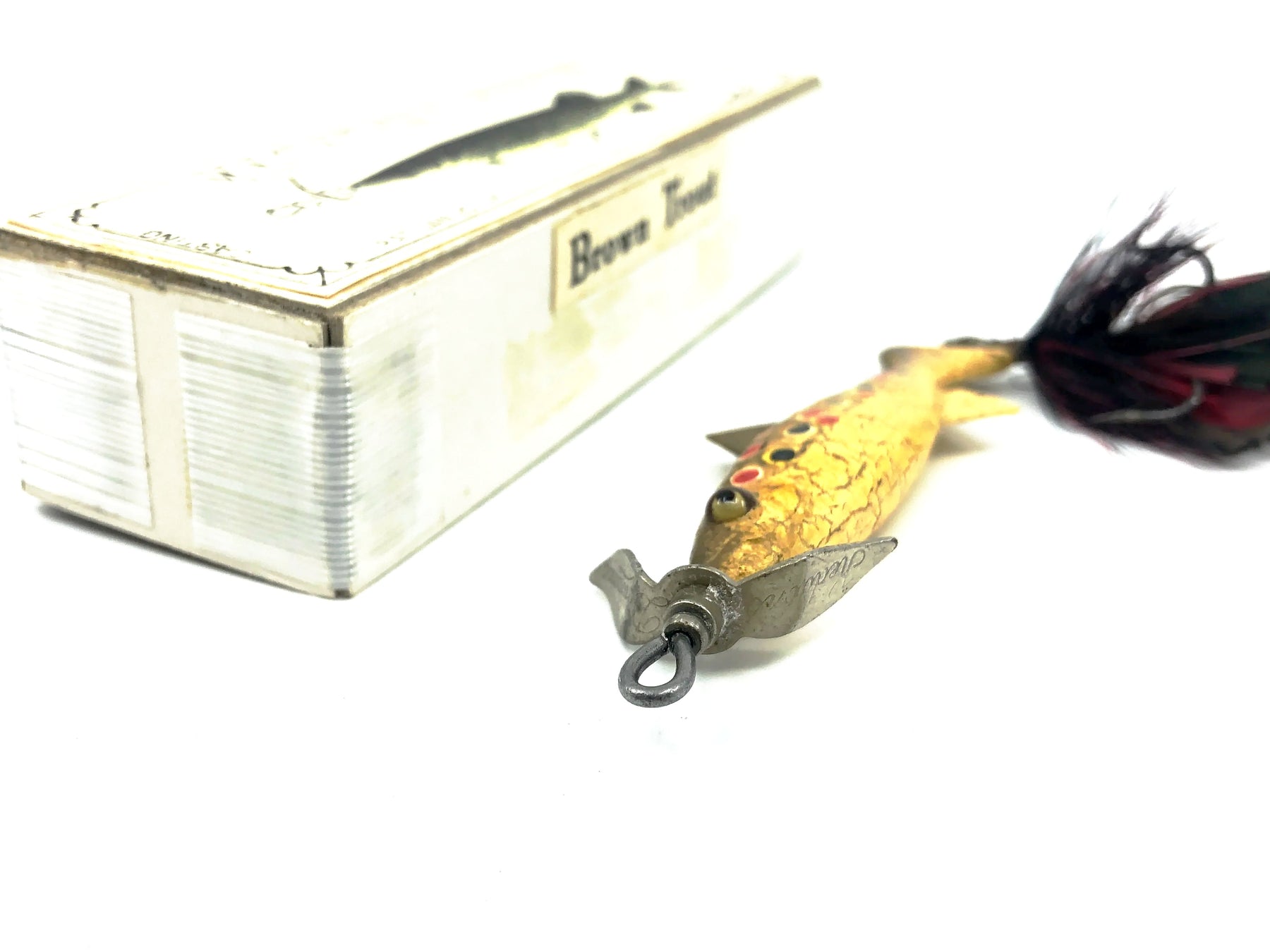 Macatawa Bait Co. 3" Minnow, Brown Trout Color w/Box - 1st Version Box. About 3" long excluding the original Heddon Spinner prop and treble hook. Wooden lure, glass eyes. Lure is in good shape. The matching box does have some minor wear but is in overall good condition. See photos.