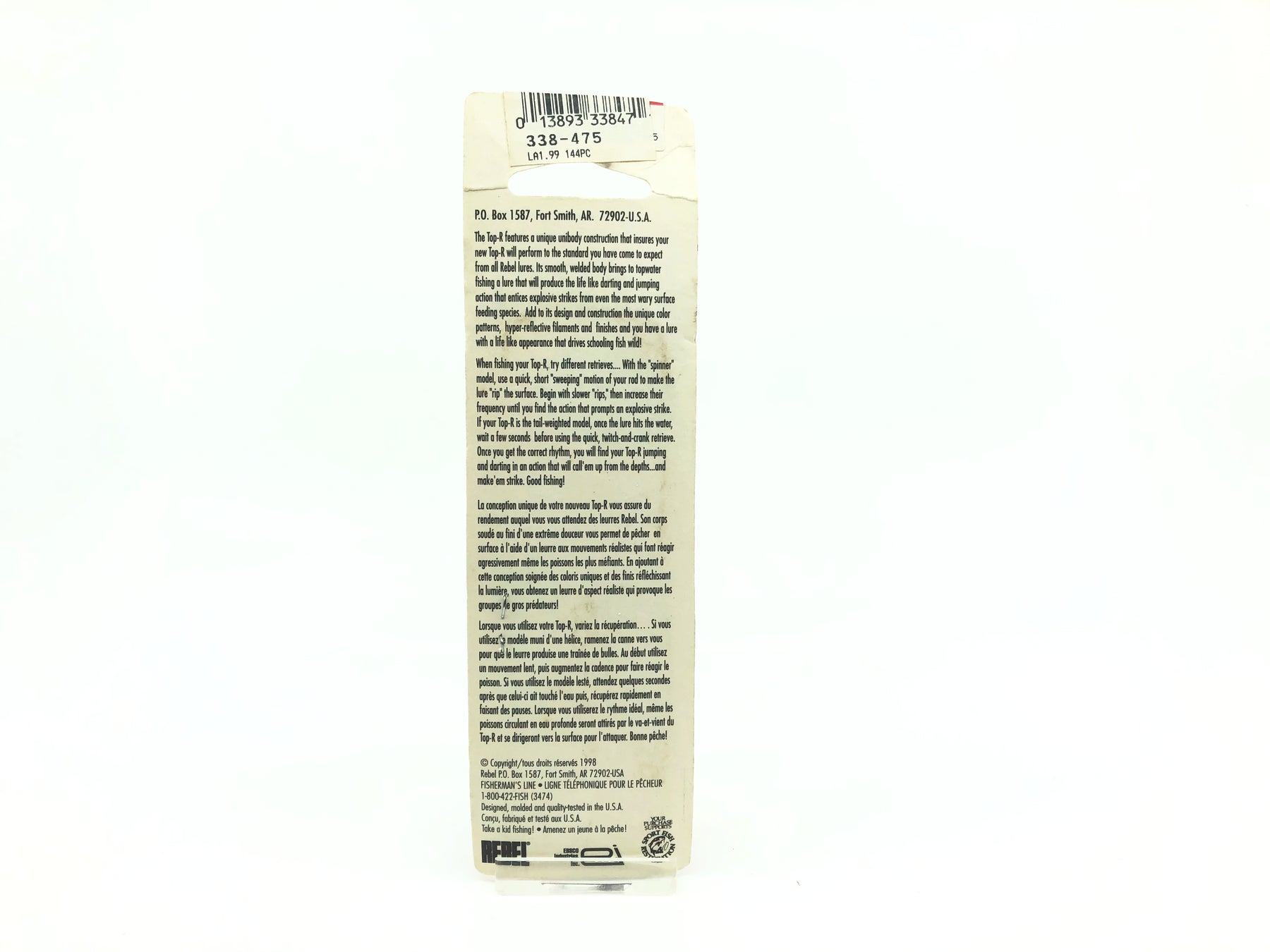 Rebel Top-R Black/Clear Sparkles on Card. Harder to find Rebel that was only made for a very short time. About 2 3/4" long. Card is in good condition with a staple in the bubble, lure new on card. Old stock from 1998. Fish or collect, see photos.
