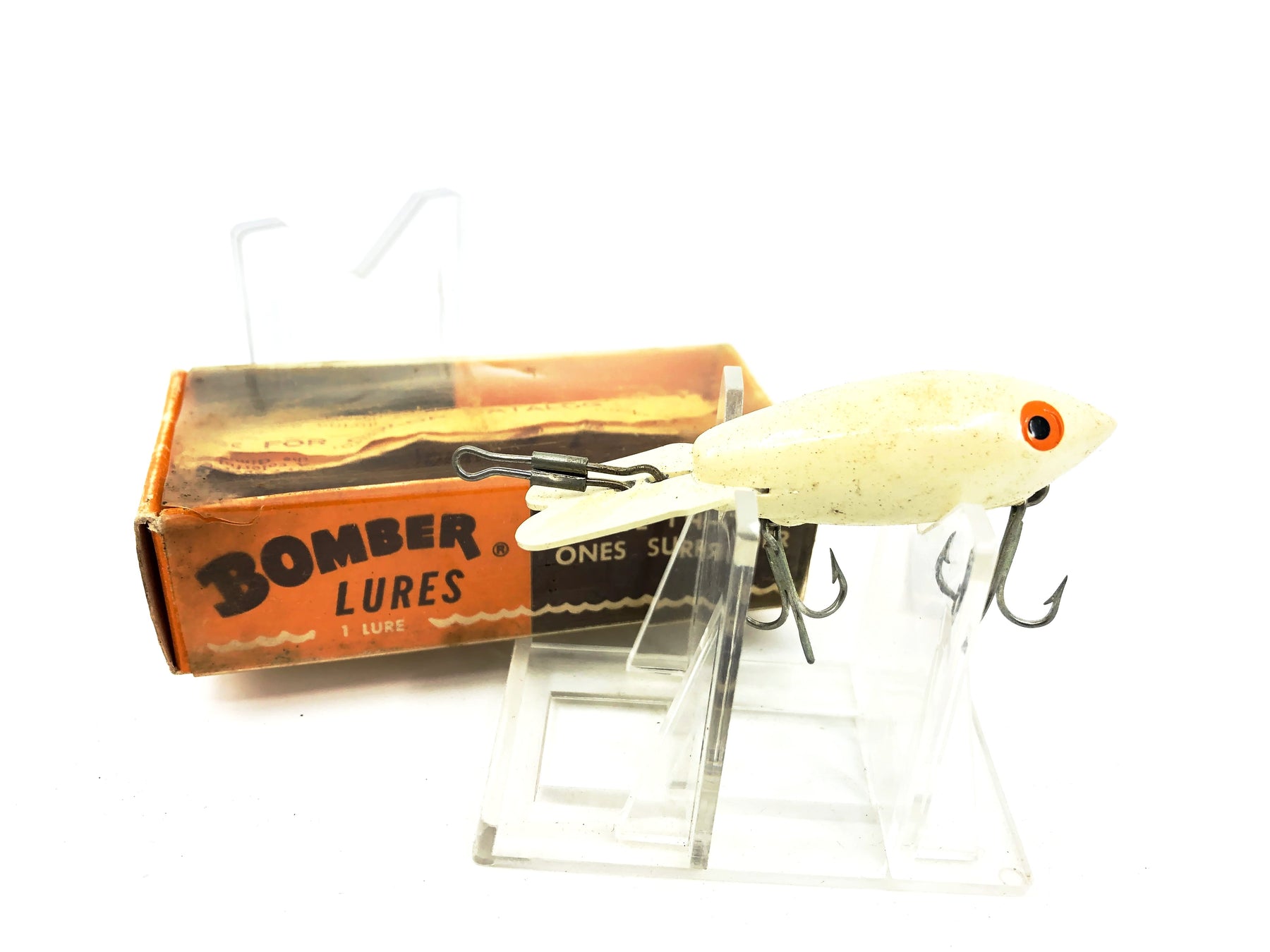 Bomber 200 Series, #01 White Color with Box. Box is matching. About 2 1/2" long. This lure has some minor wear and marks but in overall good condition. Box has a good amount of wear and marks still in overall good condition, see photos. One of the all time greatest lures in an iconic color. Fish or collect.