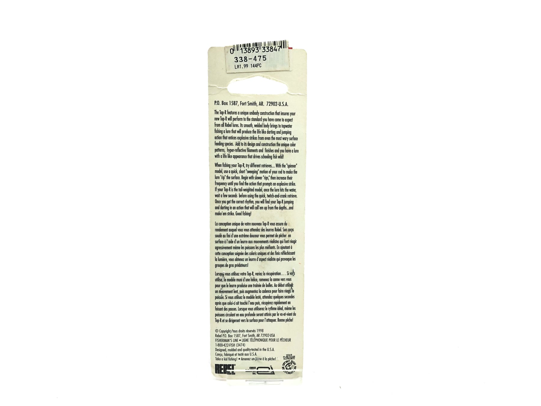 Rebel Top-R Black/Clear Sparkles on Card. Harder to find Rebel that was only made for a very short time. About 2 3/4" long. Card is in good condition with a staple in the bubble, lure new on card. Old stock from 1998. Fish or collect, see photos.