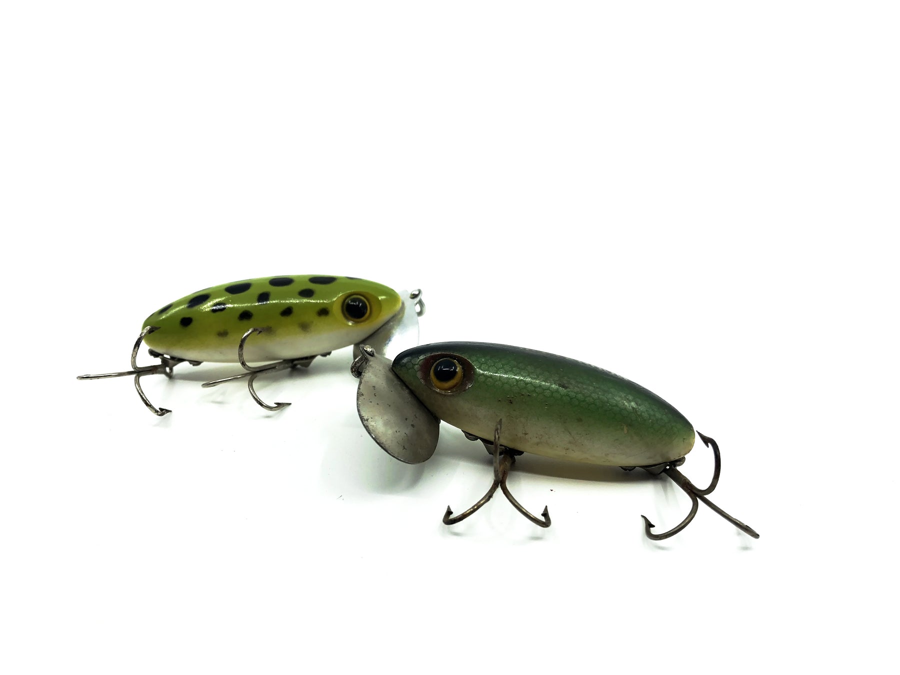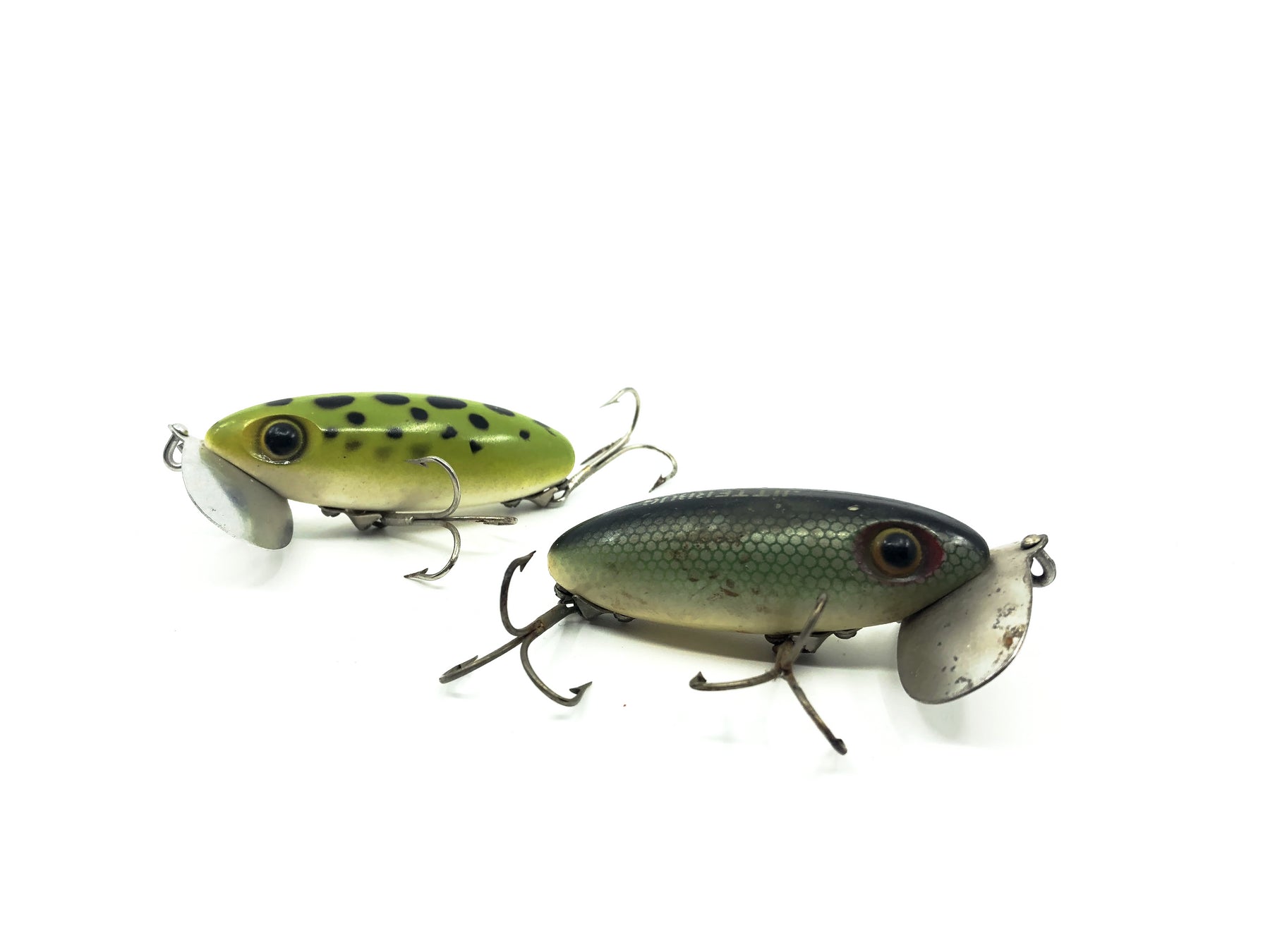 Two Arbogast Jitterbug Frog/Shad Colors. Great deal here! Both lures are about 2 1/2" long. Used with some wear but still overall ok condition. Fish or display, see photos.