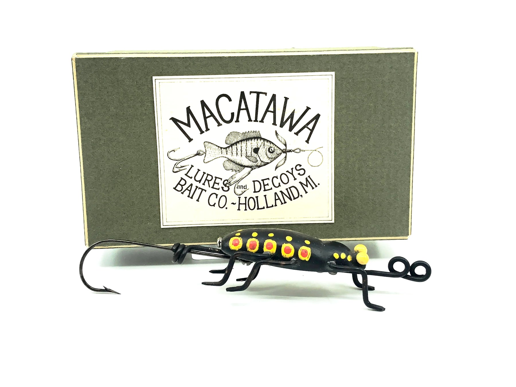 Macatawa "Old" Beetle w/Box. Unsure why this is marked as an "old" Beetle: it could be the name of this color or maybe that this is an older model of a beetle (what we believe it is.. notice the hook is the opposite way you normally see them). This Macatawa Beetle is about 4 1/4" long overall (1 3/4" body). Wooden lure with metal works. Lure is in amazing shape. The matching box is in overall good condition. See photos.