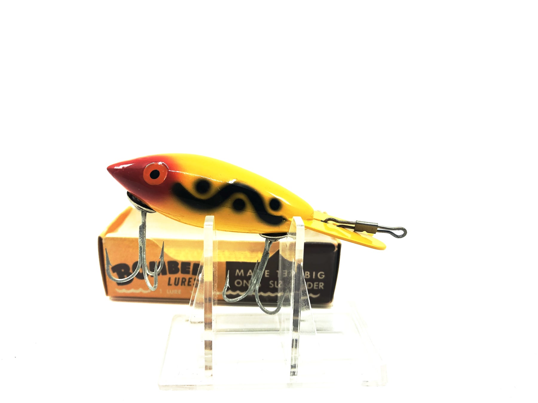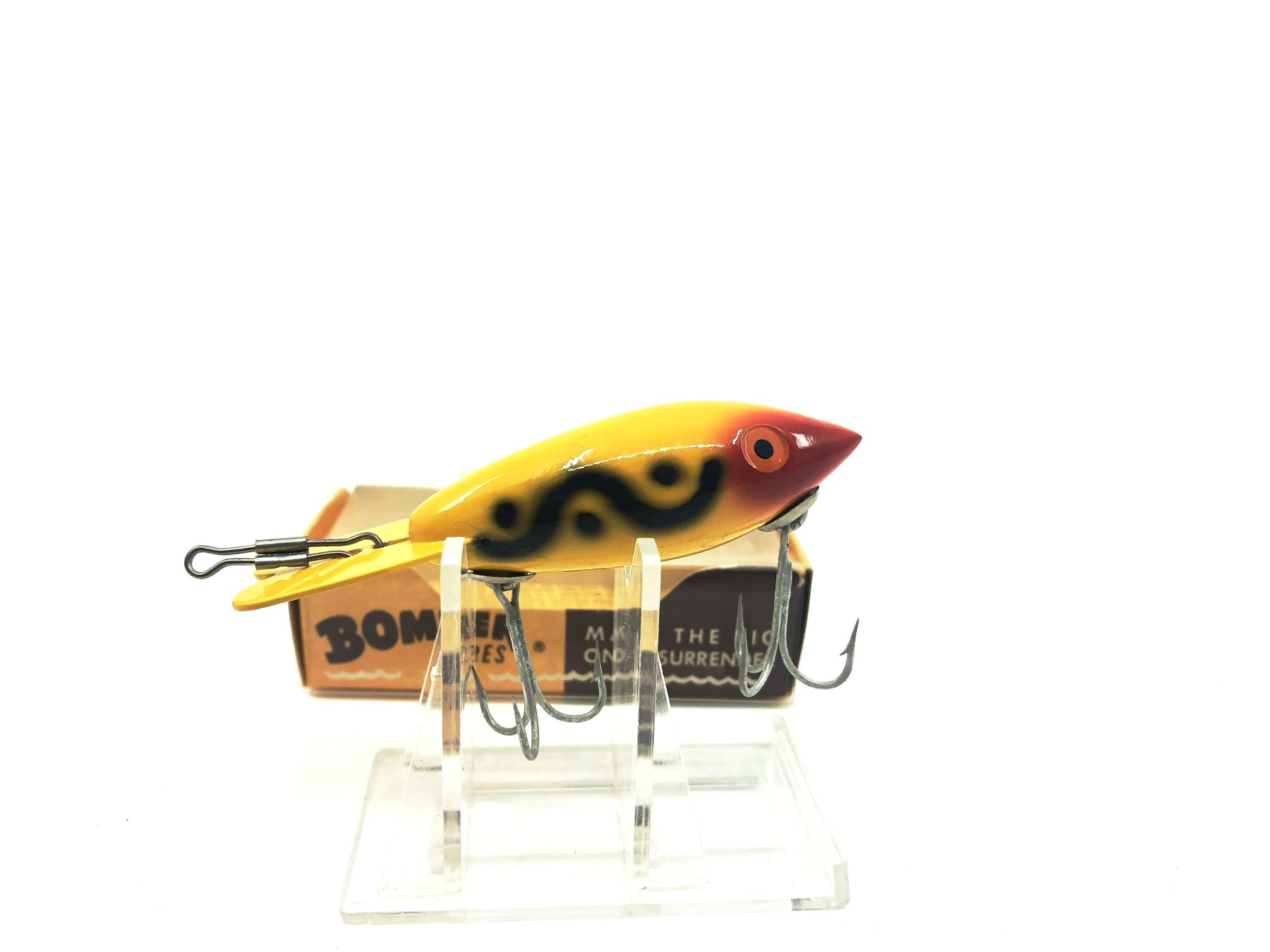 Bomber 400 Series 457 Yellow Black Shadow Stripe Color with Box. At about 3 1/4" long this Bomber is in good condition with little wear or signs of use. Classic lure that isn't made anymore fish or collect. See photos. Rattle version. Plastic sleeve is cracked the entire length though but overall nice shape.