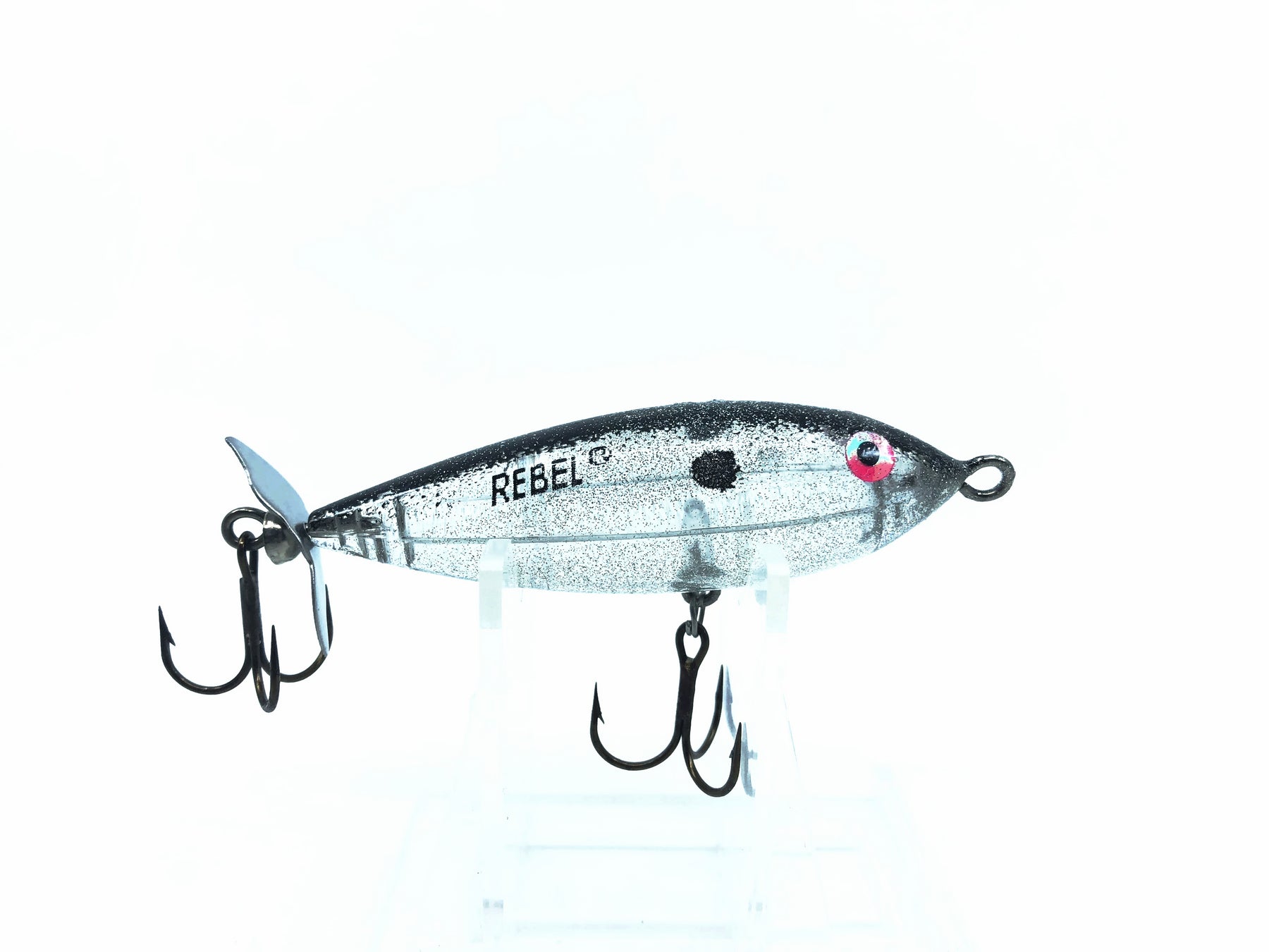 Rebel Top-R Black/Clear Sparkles. Harder to find Rebel that was only made for a very short time. About 2 3/4" long. In great condition aside from some minor wear. Fish or collect, see photos.