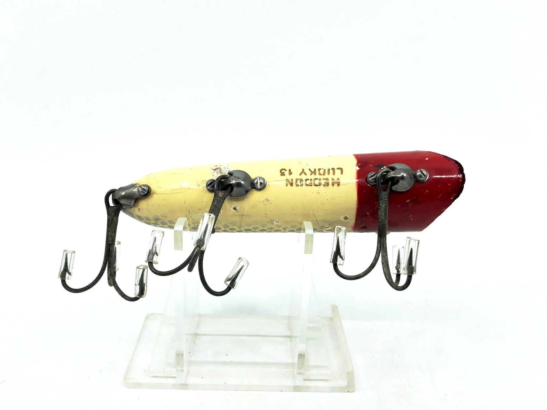 Heddon Original Wooden Lucky 13, PRH Shiner/Red Head Color. About 3 3/4" long. Nail eyes. Nice vintage lure here. Lure is used with some wear but still in overall good condition. See photos. Fish or collect this classic Heddon lure.