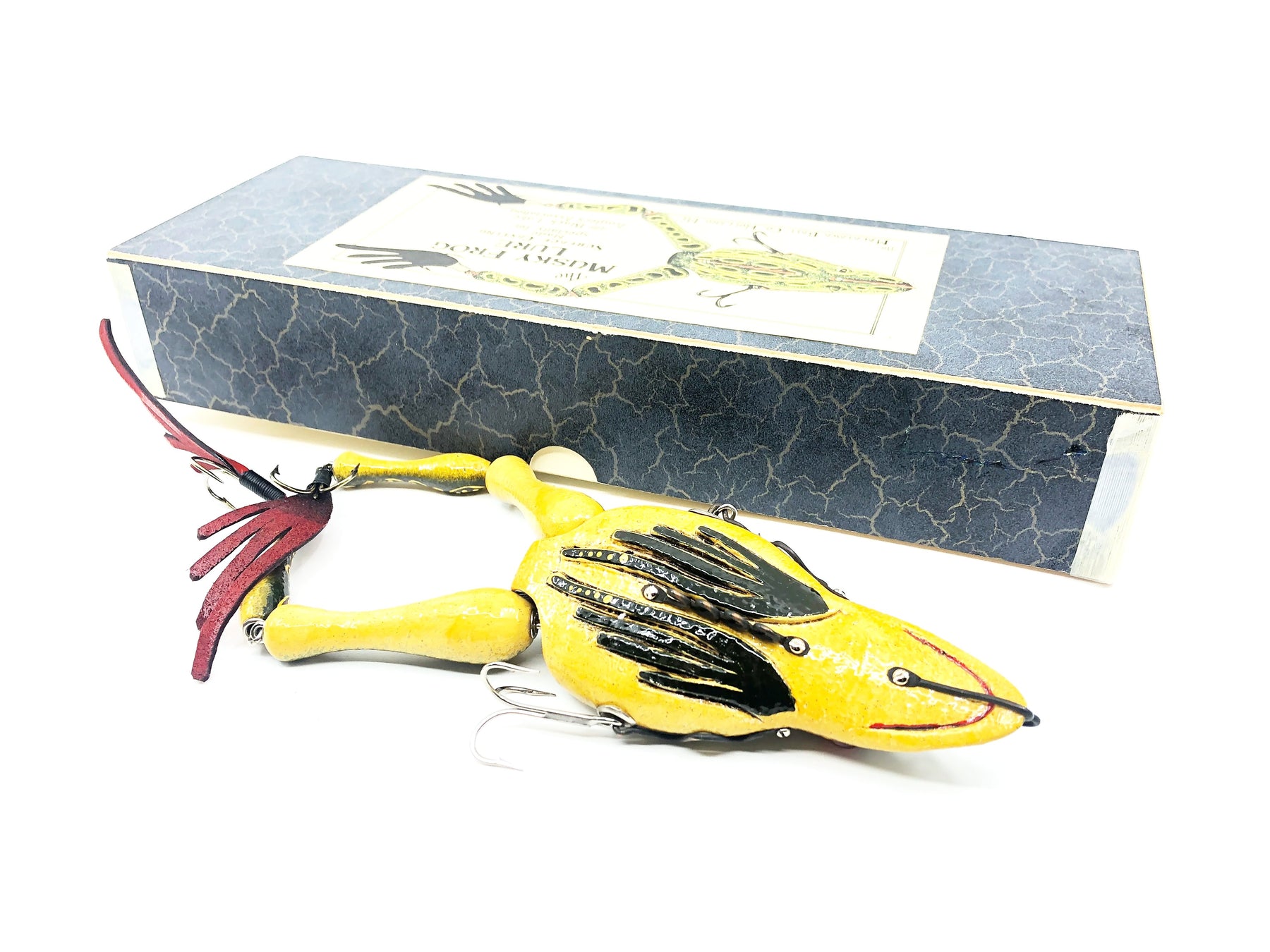 Macatawa Bait Co. Musky Frog Green/Gold/Black Scale Color w/Box. Older Macatawa bait here from the 80s or 90s. Lure's body is about 9 1/4" excluding the leather feet (about 13" fully extended). Hand carved basswood, glass eyes and leather feet. Lure is in amazing shape. The matching box does have some very minor storage wear but is still in great condition. See photos.