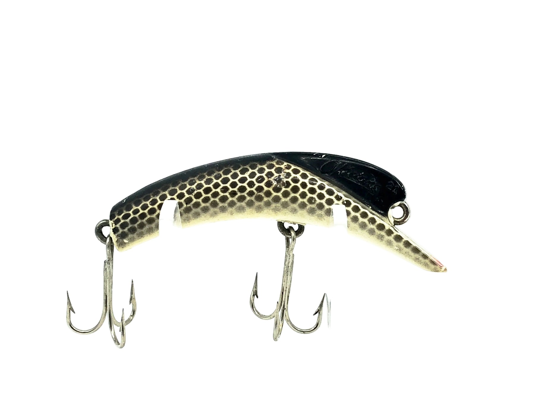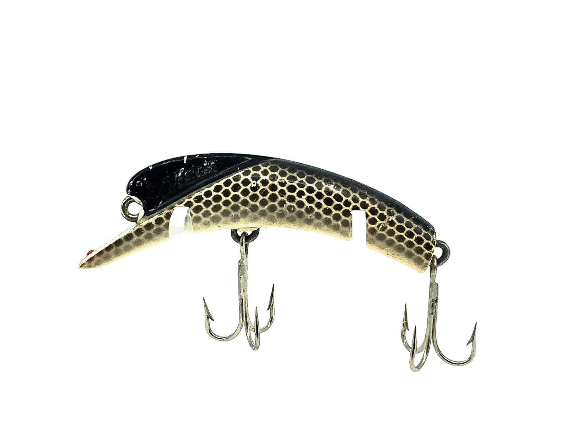 Nebco Ok-Doke No.21, Black Scale Color. Very uncommon lure from the wave of "Banana" shaped lures that brought Lazy Ike and Flatfish fame. Lure is about 2 3/8" long. This bait is used with some minor wear but in overall very good condition. Fish or collect this bait, see photos.