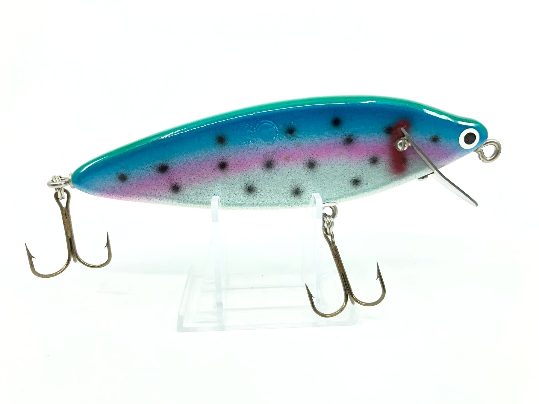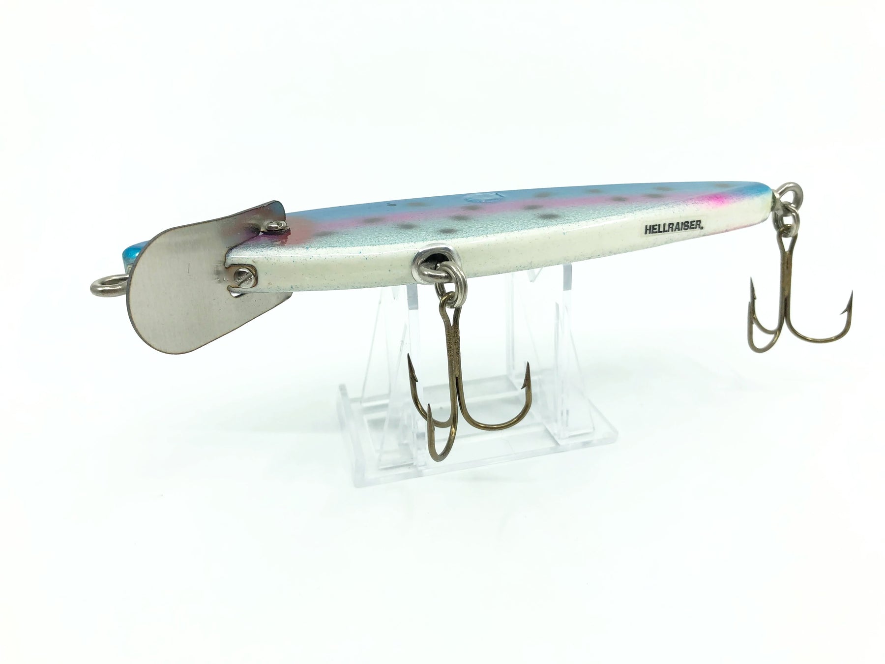 Vintage Hellraiser Psycho Path Musky Lure 6" Rainbow Trout Color. Made by the former Hellraiser Tackle Company from Lake Tomahawk, Wisconsin. Used but real nice shape, see photos. Tough to find these lures anymore. Fish or collect this great wooden bait.