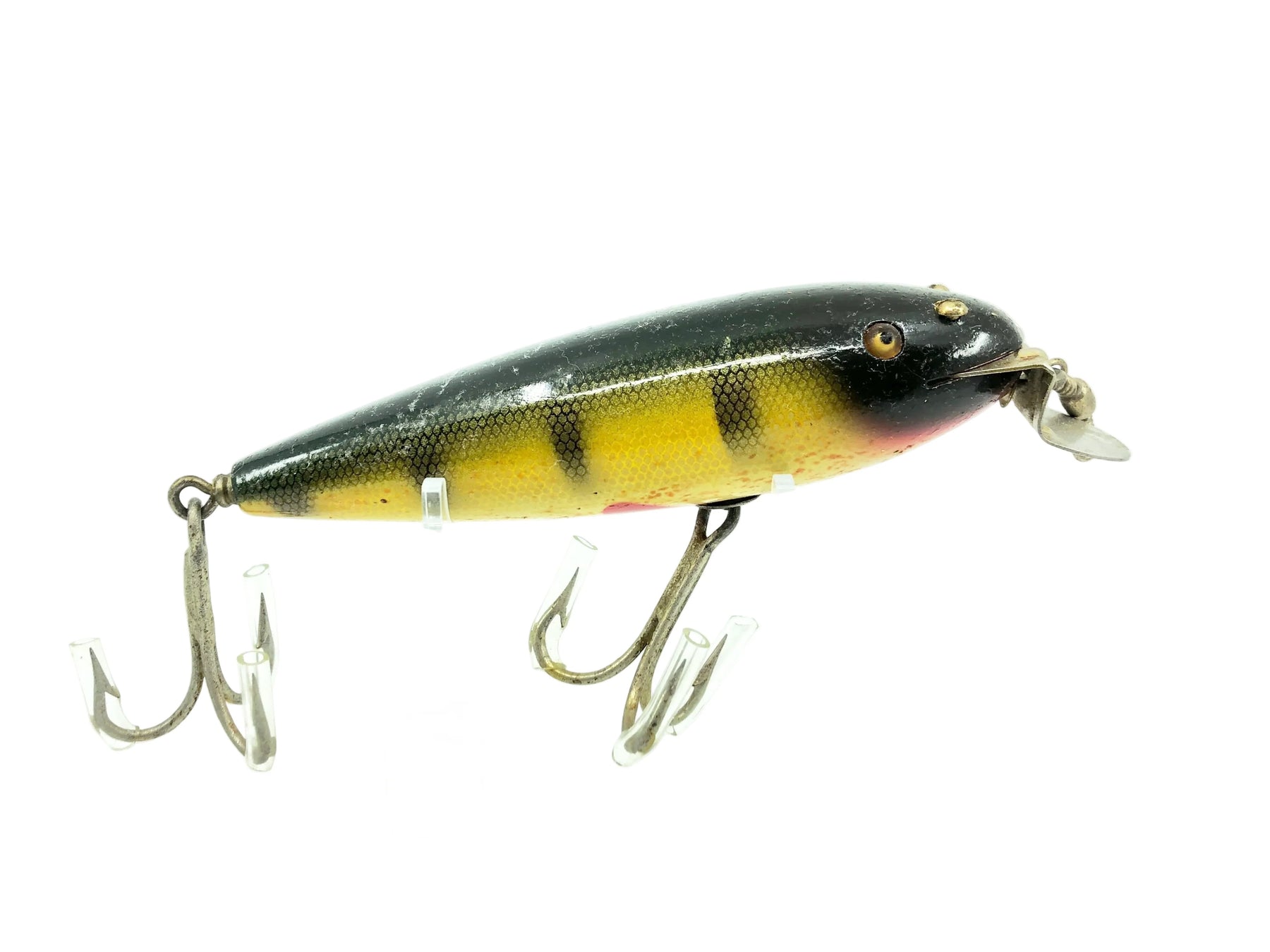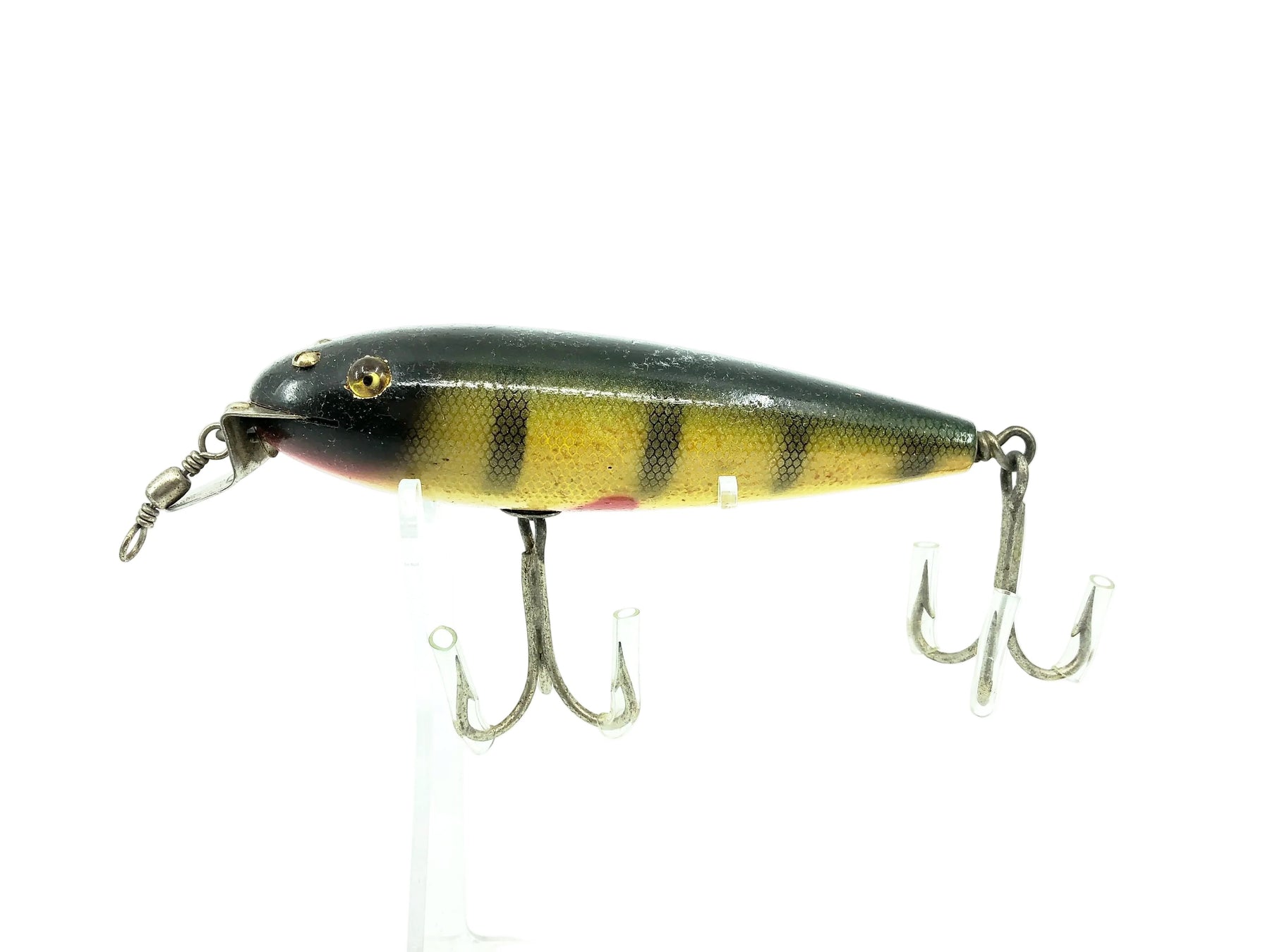 Creek Chub 600 Husky Musky, #01 Perch Scale Color 601. About 5" long body. This one is an early one. This lure has a few marks and residue but is in overall good condition. Still an awesome example of an early Creek Chub bait. See photos. Wooden lure. Tough early bait to find. A classic bait! Very collectible.