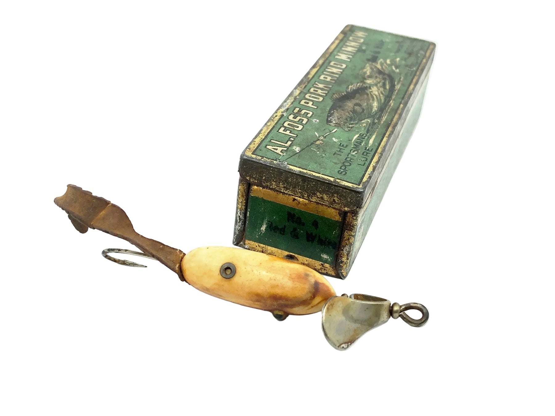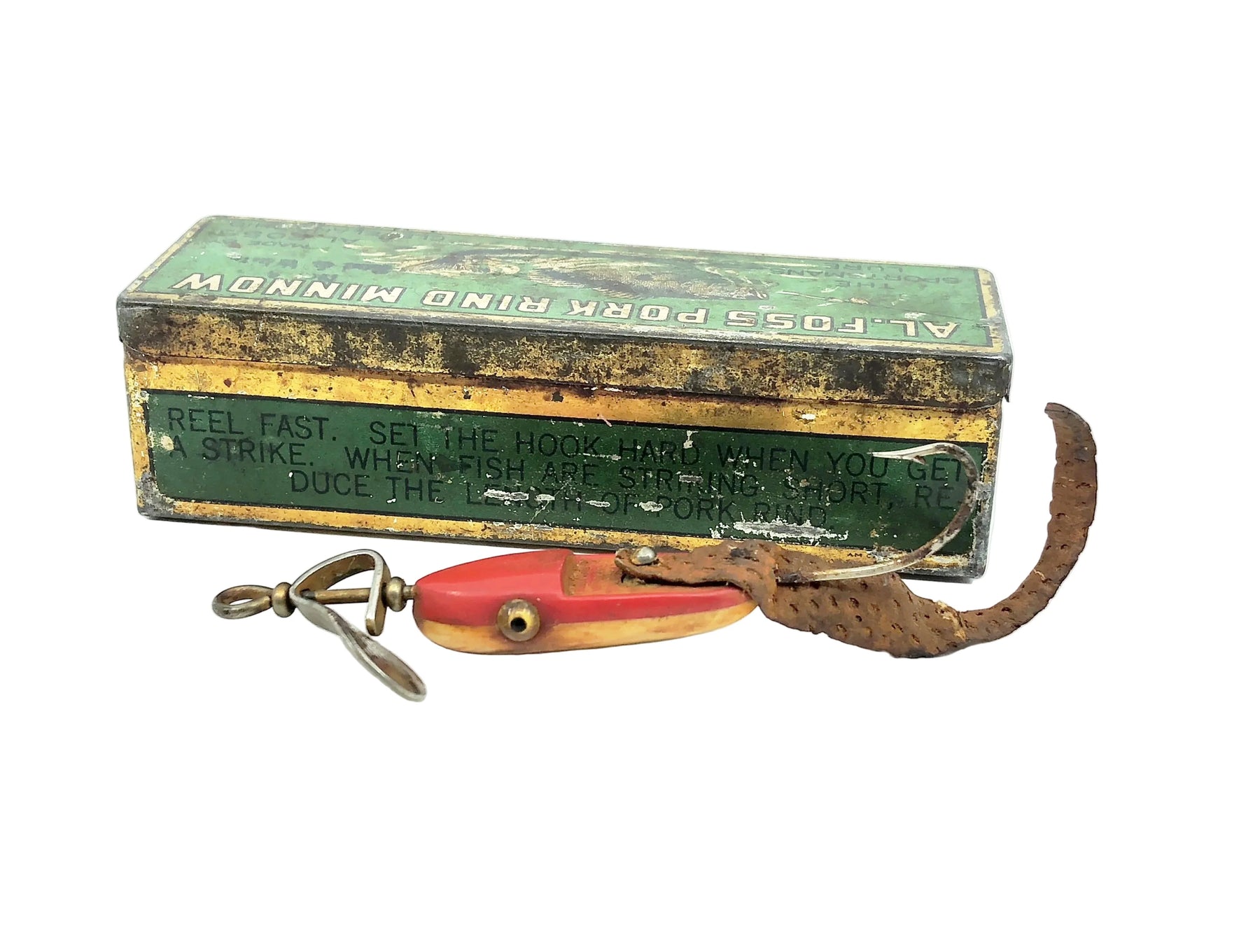 Al Foss Oriental Wiggler No.4, Red/White Color. Great deal here. This Wiggler is about 3 1/2" long from hook to line tie. Lure is used with some wear and staining but this is in ok condition. Metal box is in good condition with some wear and marks. Fish or collect, see photos. Glass eyes, although have cracks.
