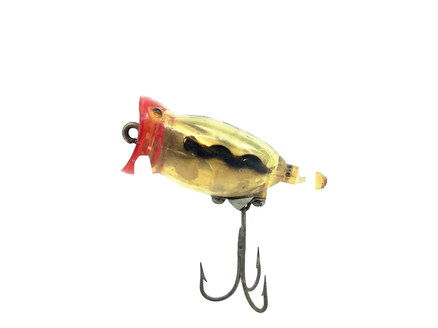 Arbogast Hula Popper 770, Silver Reflector/Shadow Stripe Color. Lure body is about 1 1/2" long. Great bait here. Lure is used with some wear, a missing skirt, and the foil inside is somewhat messed up, but still this Hula Popper is in good condition. Missing skirt. Fish or collect. See photos.