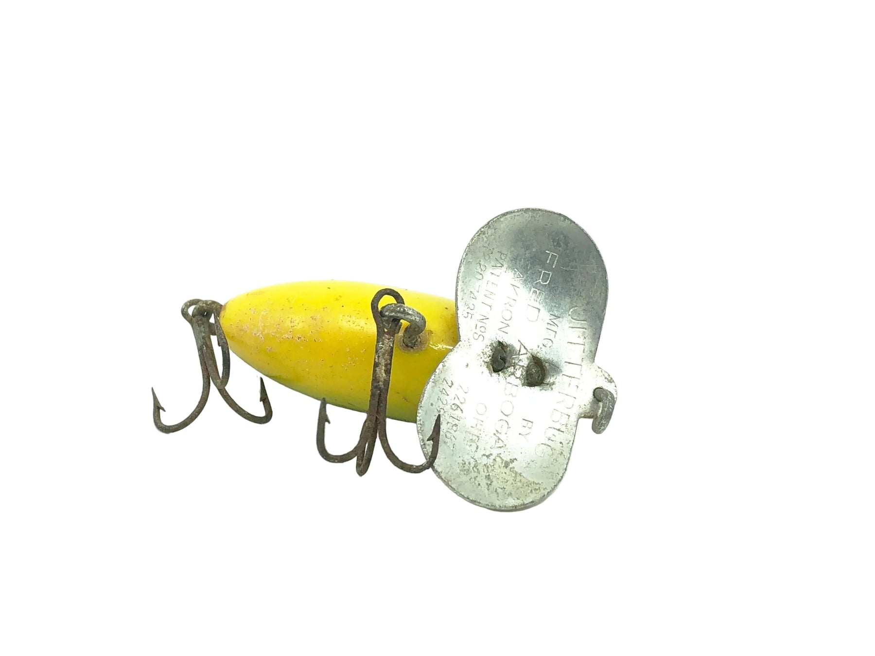 Arbogast Jitterbug 3/8oz, Frog/Yellow Belly Color. Smaller sized Jitterbug at about 1 3/4" long. Used with some wear and a replaced belly screw but overall fair condition. Fish or collect this iconic lure, see photos.