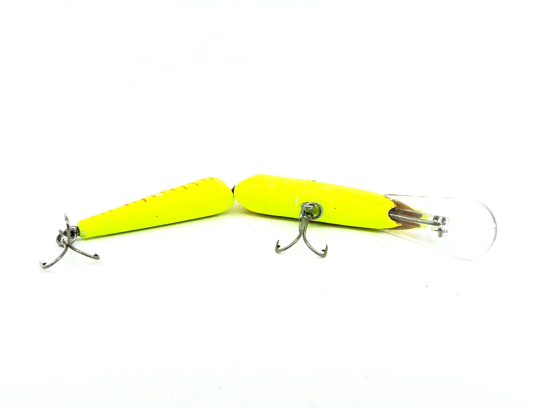 Bagley Jointed Diving Bang O #5-119, Orange Stripes on Yellow Color. Balsa body is about 5" long. Used with some minor wear and marks but this is in overall good condition, see photos. Lip writing indicates this as a Winter Haven Bang-O. Add this great bait to your collection while it lasts.