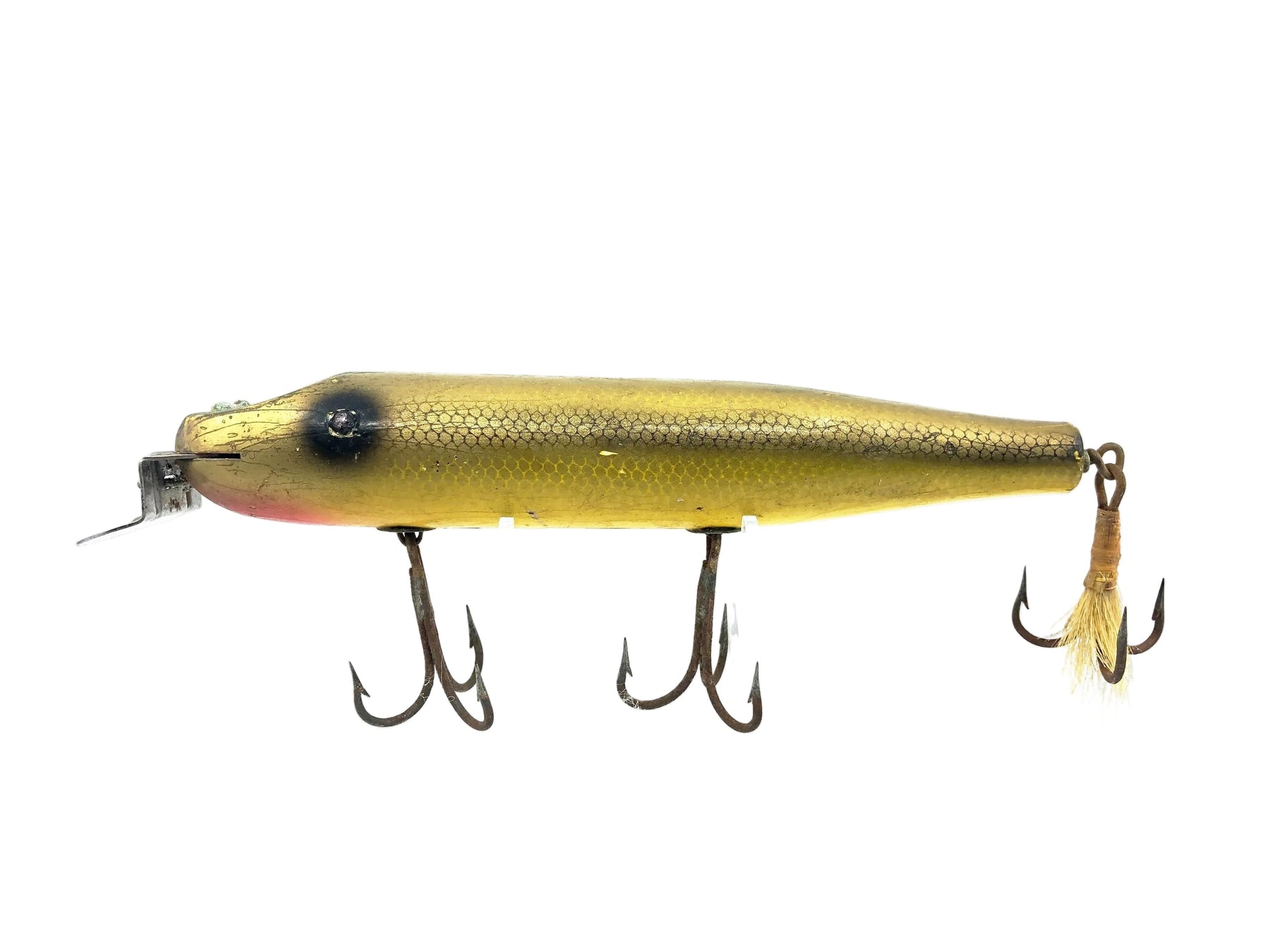 Creek Chub Wooden Giant Straight Pikie 6000, #06 Goldfish Color. Lure is about 8" long excluding the lip. Lure is used with some wear and marks, but in overall fair condition. Getting tougher to find these and in a desirable color Fish or collect. See photos.