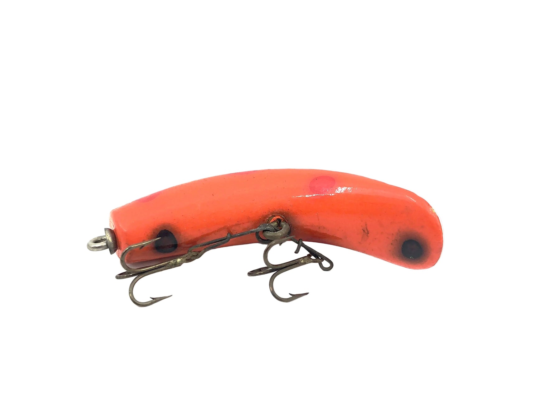 Helin Flatfish SPS, Orange/Dots Color-Wooden. About 2 5/8" long. Used with some minor wear and missing it's back hook but overall in good condition, see photos. One of the most successful fishing lures ever made. Fish or collect! Vintage wooden version.