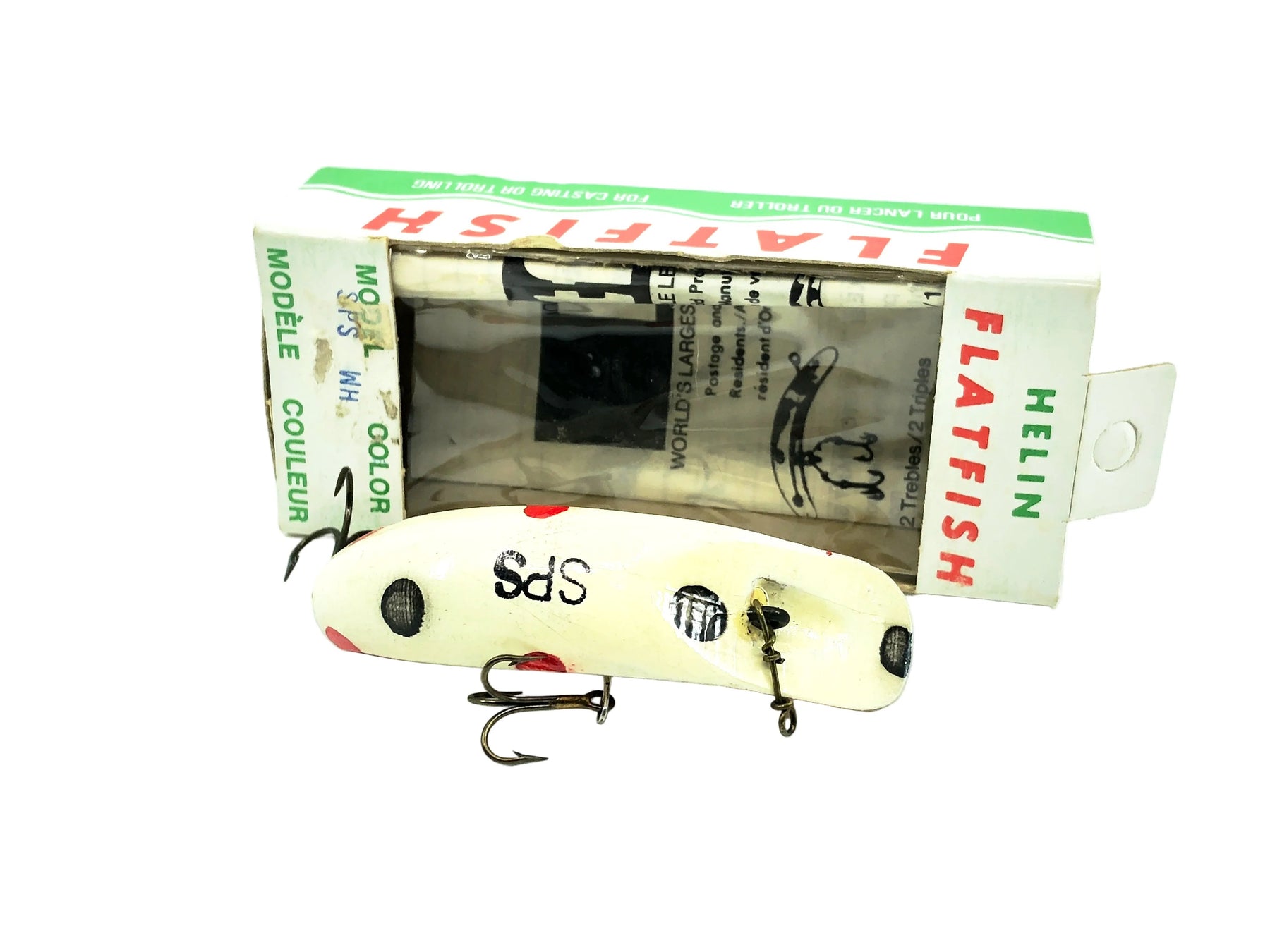 Helin Flatfish SPS, WH White/Black Red Spots Color with Box-Wooden.  About 2 5/8" long.  Lure is new in box, the box has some minor wear and damage to the plastic film, but otherwise in good condition. See photos. One of the most successful fishing lures ever made.  Fish or collect!