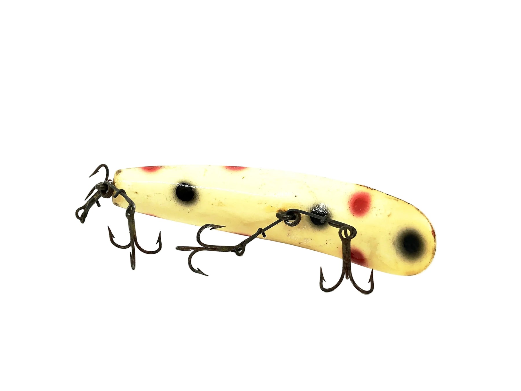 Helin Flatfish T4, WH White/Dots Color. About 3 1/2" long. Used with wear and marks but still in overall good condition, see photos. Double hook hanger model. One of the most successful fishing lures ever made. Fish or collect! Vintage plastic version.