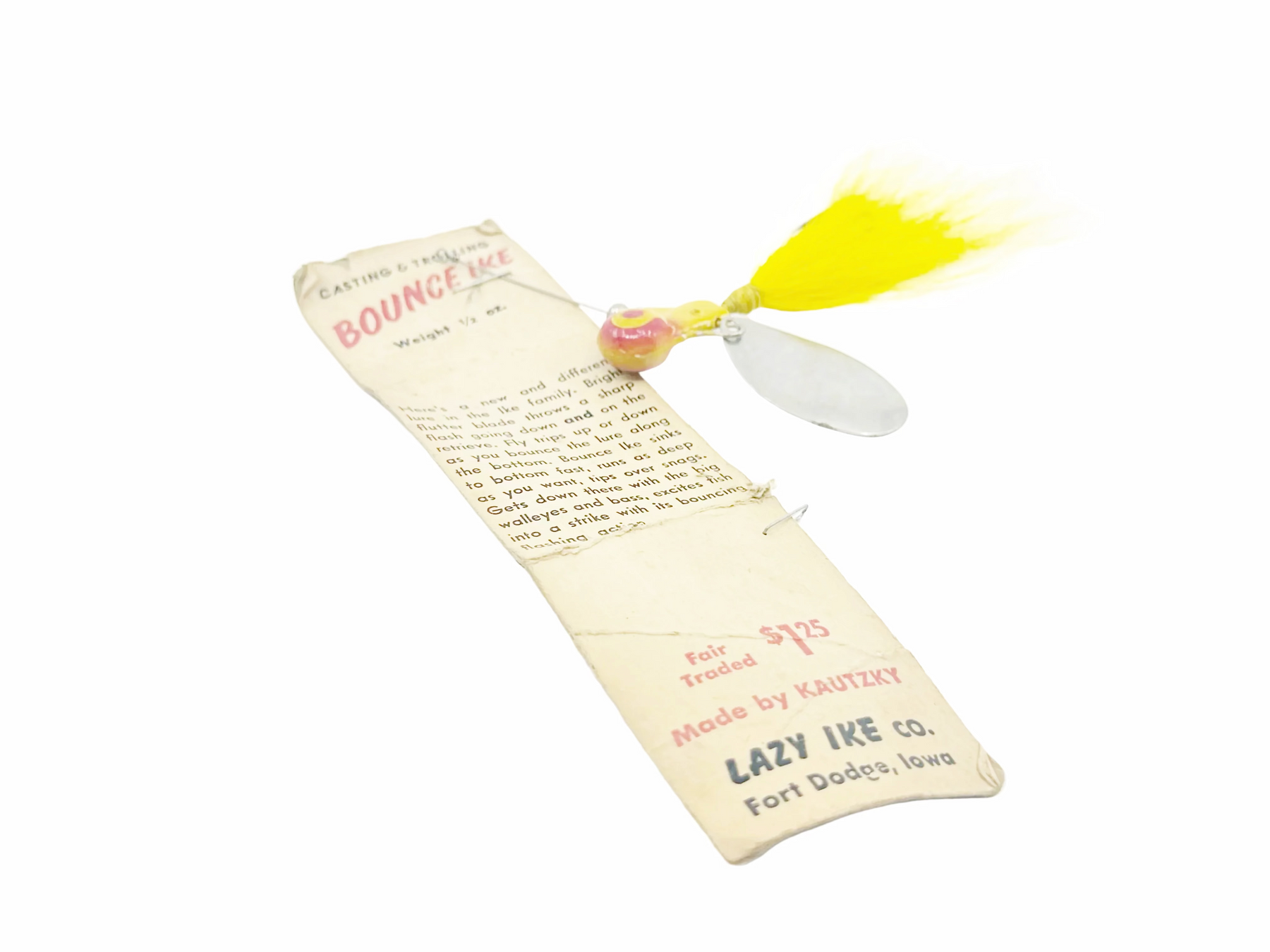 Kautzky Lazy Ike Bounce Ike on Card, Red/Yellow Color. Harder to find Lazy Ike that was only made for a few years. Lure is about 3" long overall. Lure has some wear, marks, but in overall good condition. Card is in ok condition with wear as shown. One of the greatest all time lure brands. Add this one to your collection today.