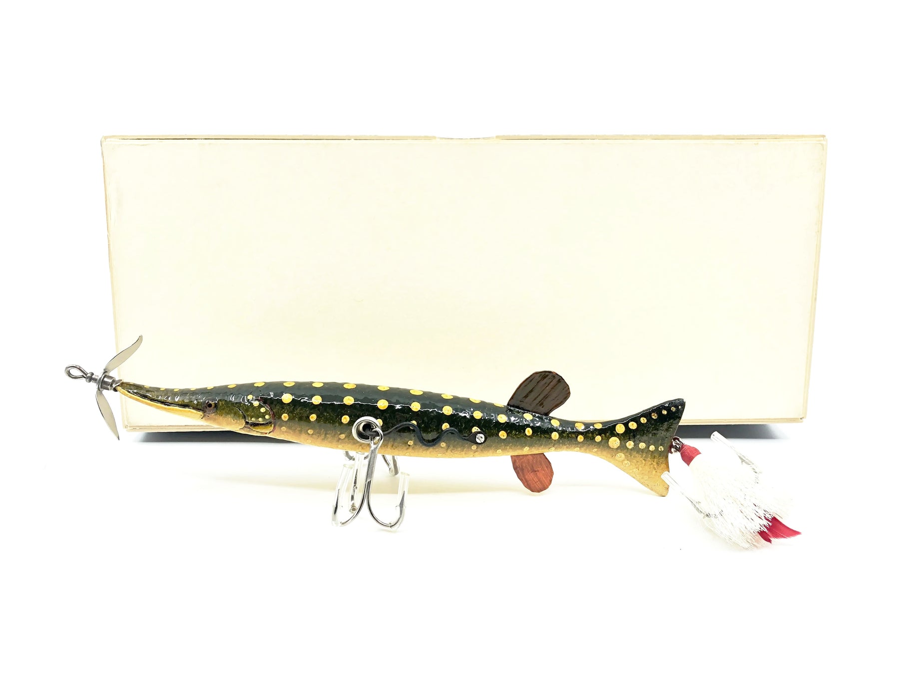 Macatawa Bait Co. Musky Size Northern Pike Lure w/Box. Classic Macatawa bait here. About 7 7/8" long body not including the hardware. Wooden lure, glass eyes. Lure is in great condition. Box in great condition with a little storage wear. See photos.