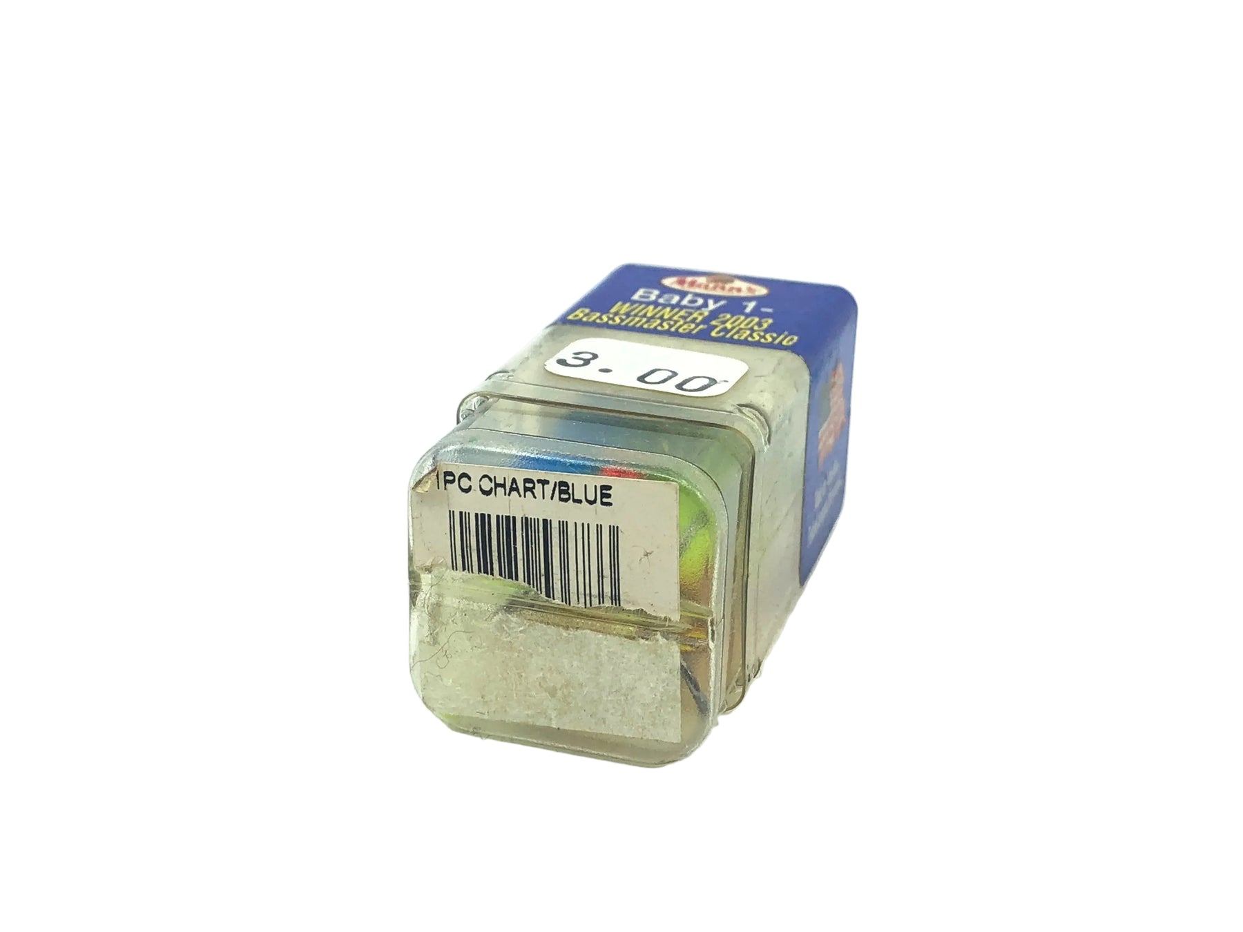 Mann's Baby 1- Minus (2003 Bassmaster Classic), Blue/Chartreuse Color. Tough Mann's packaging. This Mann's is new in box, but it does have some very minor marks from storage. Box is in good condition. Bait is about 2 1/4" long body and weighs 1/4oz. See photos.