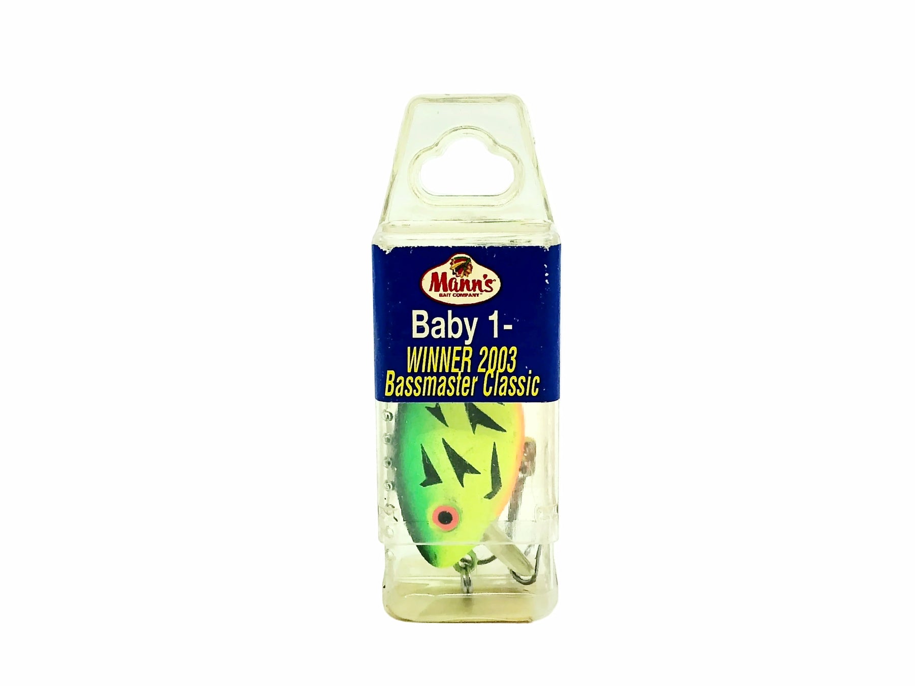 Mann's Baby 1- Minus (2003 Bassmaster Classic), Fire Tiger Color. Tough packaging on this classic Mann's. This Mann's was either used and put back into it's box or it has some marks from storage. Overall this bait is in good condition. Box is in good condition. Bait is about 2 1/4" long body and weighs 1/4oz. See photos.