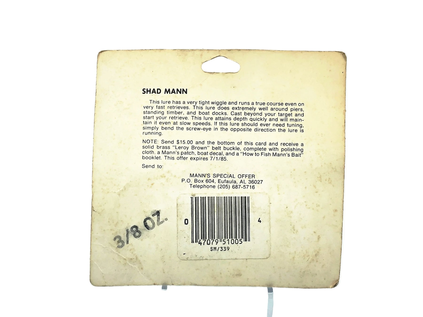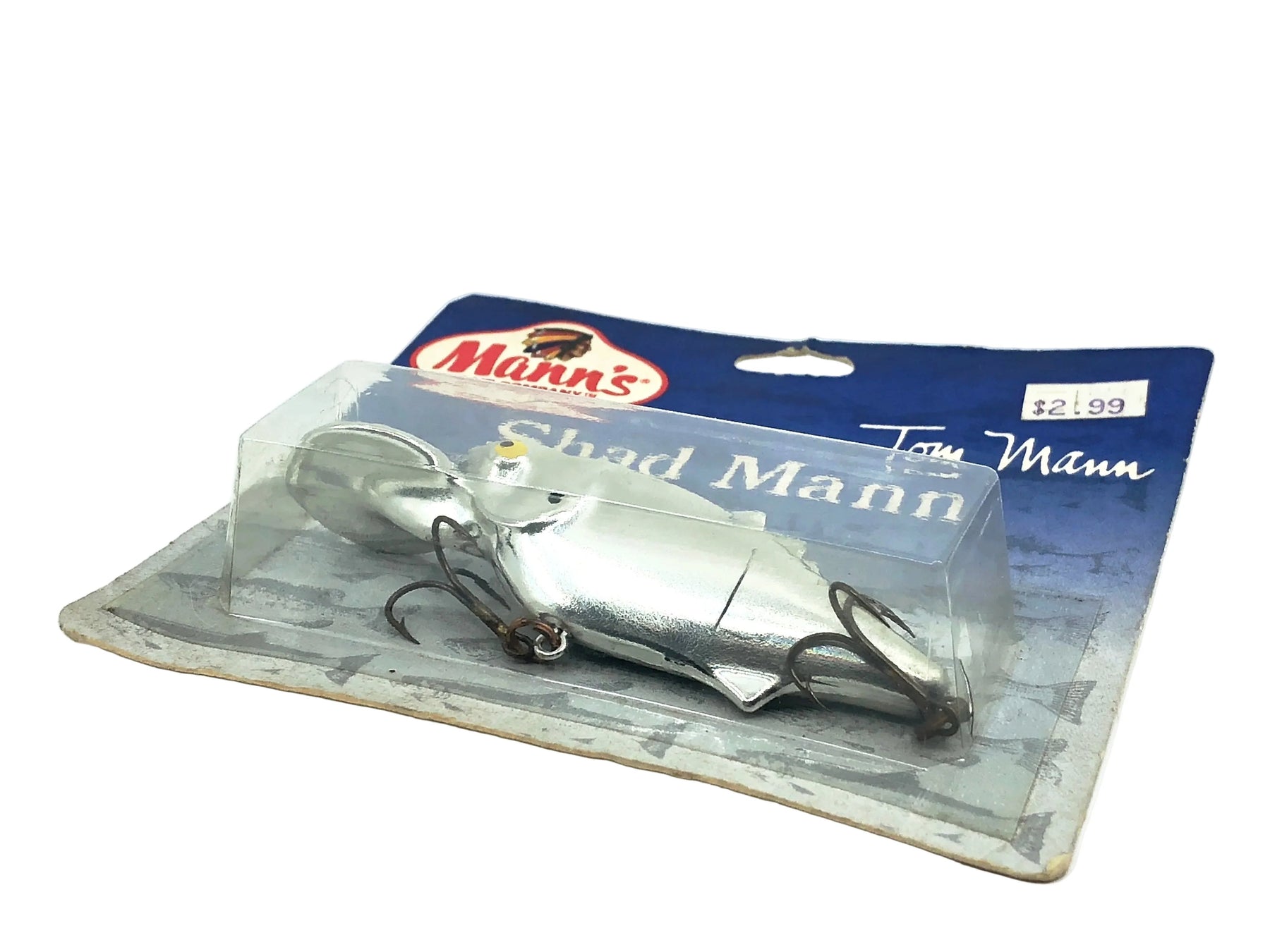 Mann's Shad Mann, Chrome Color on Card. Uncommon Mann's bait! Lure is about 3 7/8" long including the lip. Bait is new on card and card has some minor wear but in overall good condition. See photos.