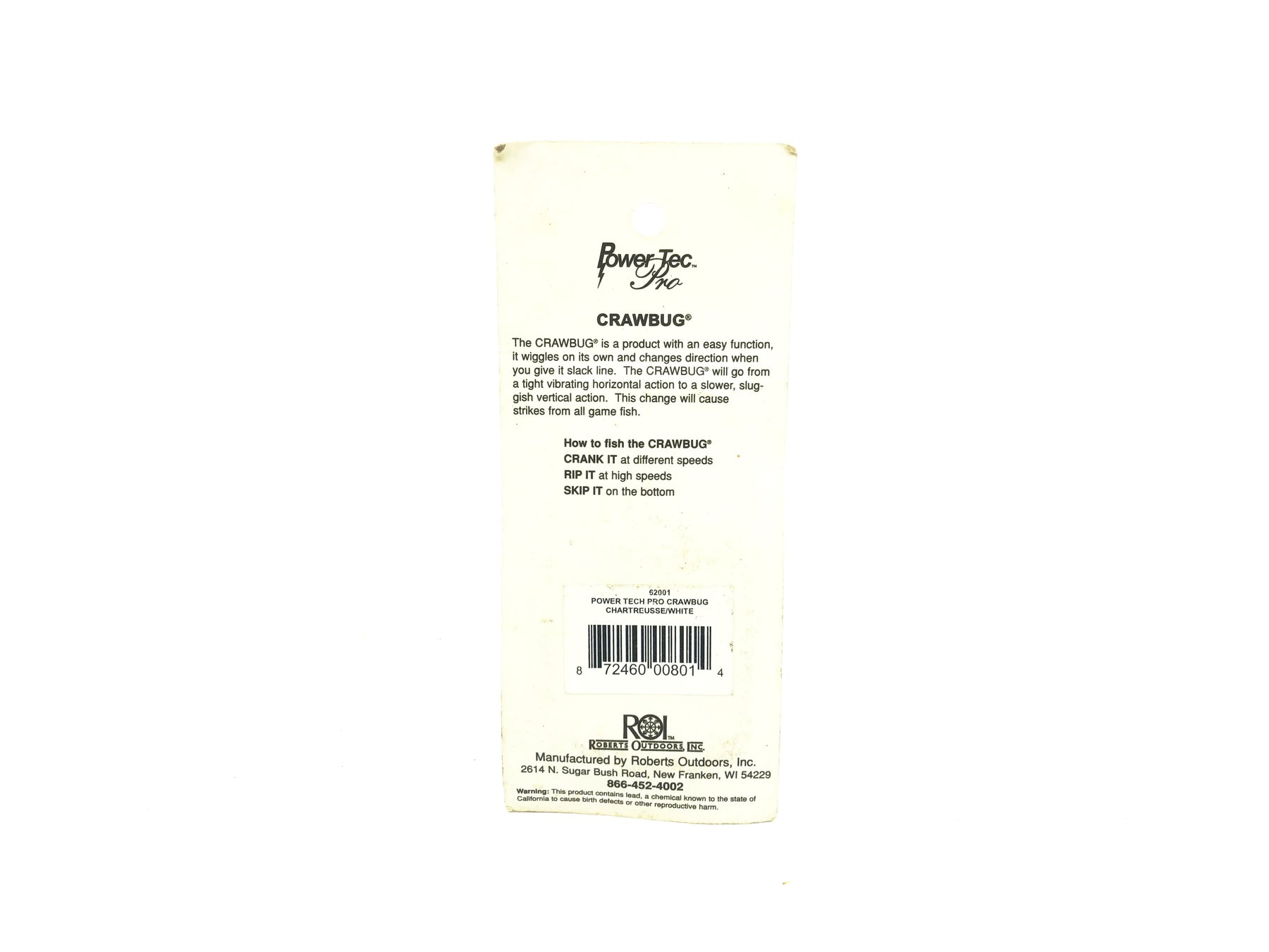 Joe Bucher Power Tech Crawbug, Chartreuse/White Color. Unique bait here. About 2 1/4" long including the lip. Card is in good condition with a minor bend, see photos. Fish or collect.