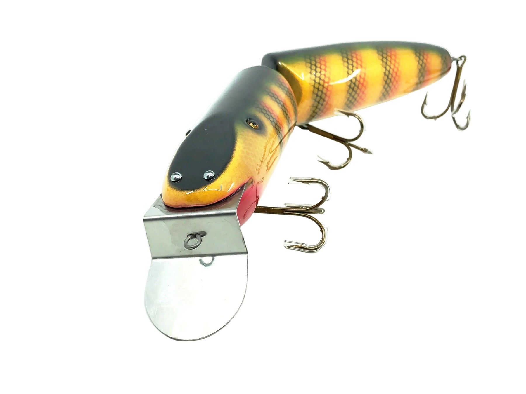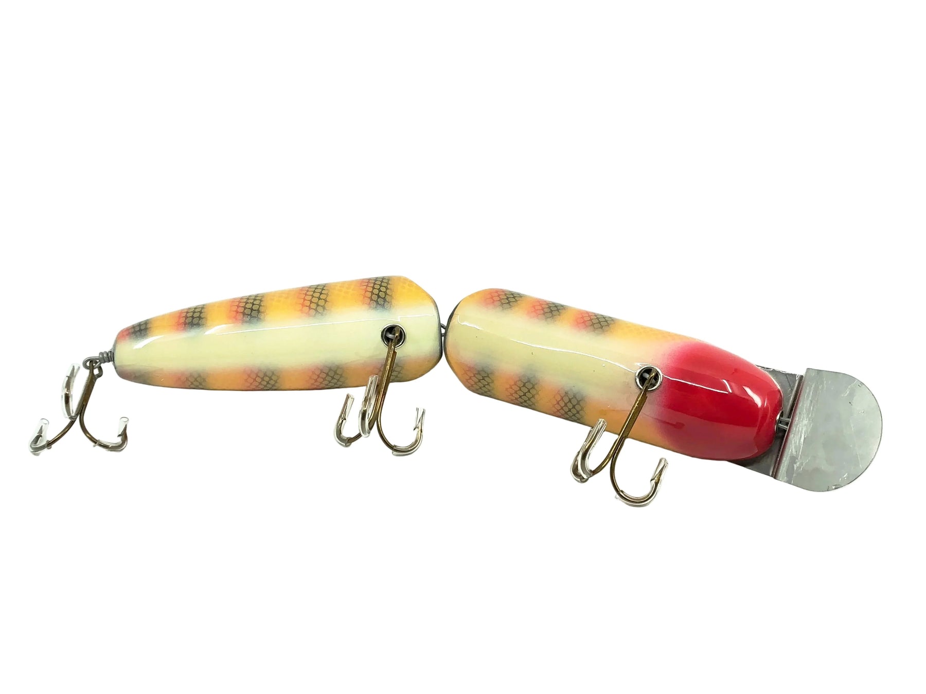 Musky Dan (XXX Lures) Giant Jointed Pikie, Yellow Perch Color. Unique Musky Dan lure here. Lure body is about 14 7/8" long including the lip. Wooden lure, glass eyes. Lure is in amazing condition. Bait has been in the same collection for over a decade. Highly sought after Musky lure from both fisherman and collectors. Fish or collect.
