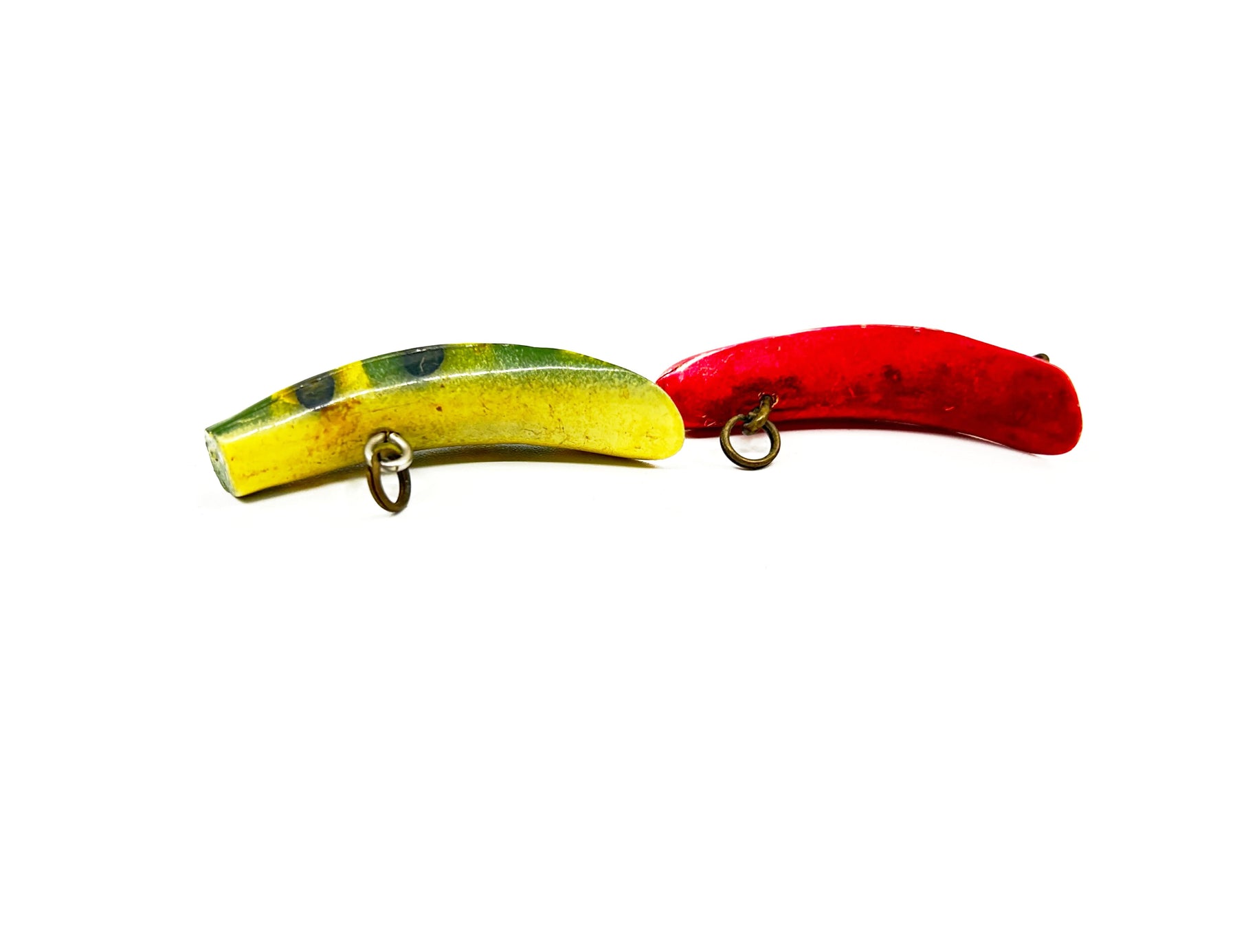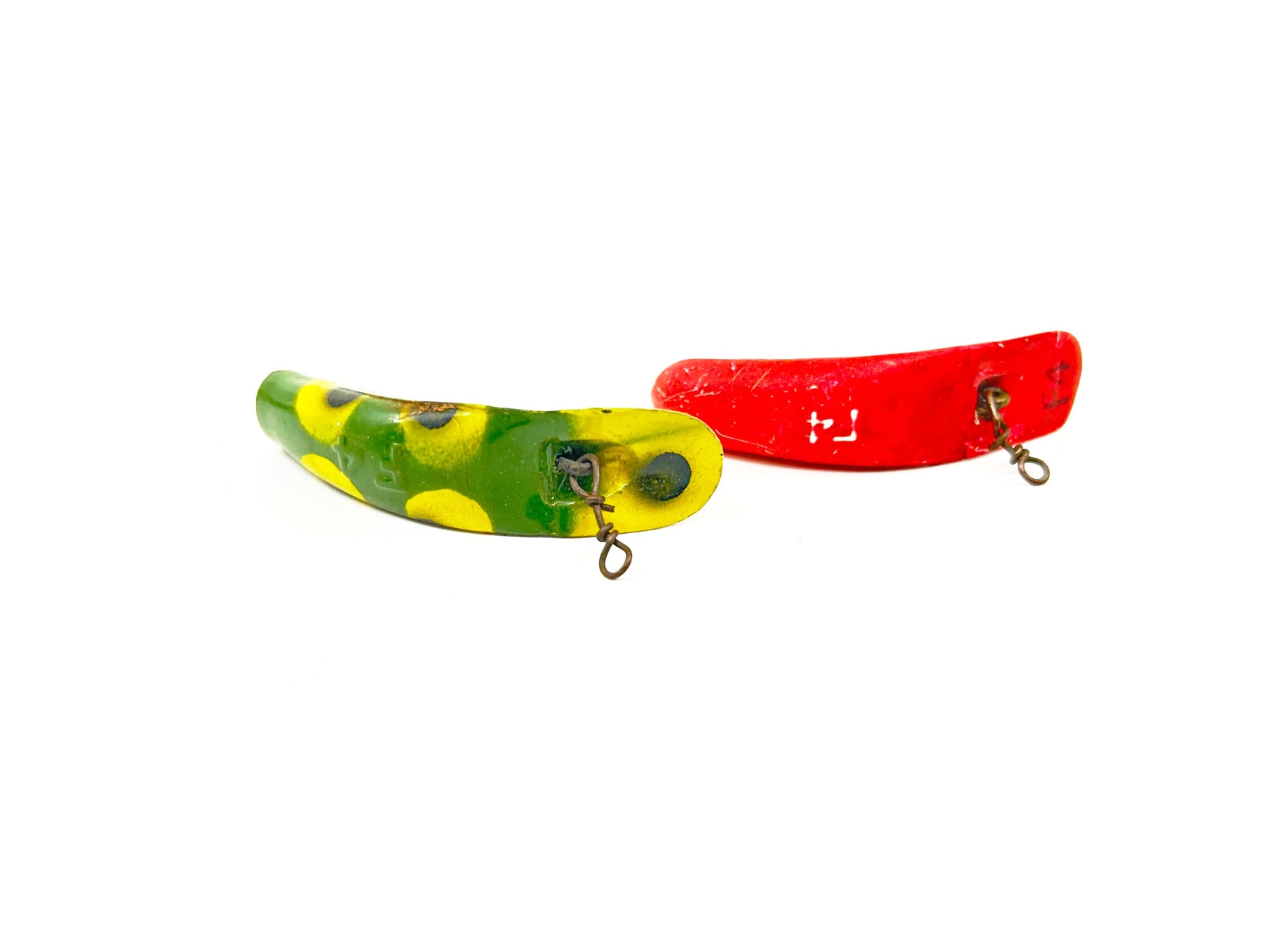 Two Helin Flatfish F4 Bodies, Frog and Fluorscent Color. About 1 1/2" long. Used with wear but overall in ok-good condition, (frog in much better shape of the two) see photos. One of the most successful fishing lures ever made. Fish or collect! Vintage plastic version.
