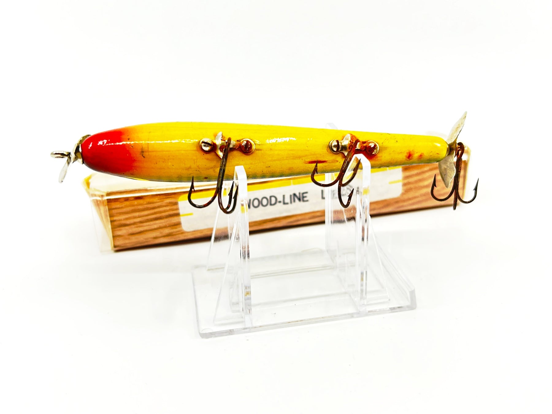 Wood-Line Lure Torpedo Bait, Blue Back / Bars Color, Wisconsin Bait. Great bait from Madison Wisconsin. Lure is about 4 1/4" long. Wooden lure. Used lure has some minor wear but overall good condition, may clean up better. Box has some minor wear and bending as well, still in ok shape. Fish or collect, see photos.