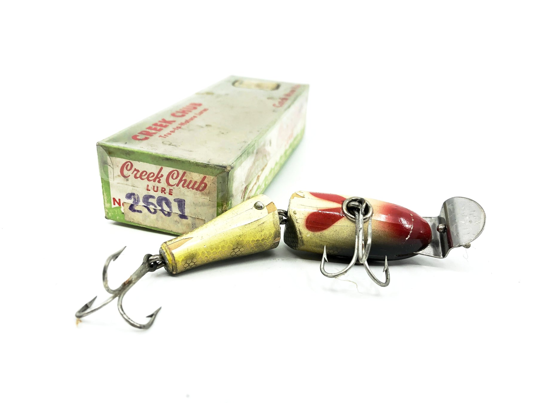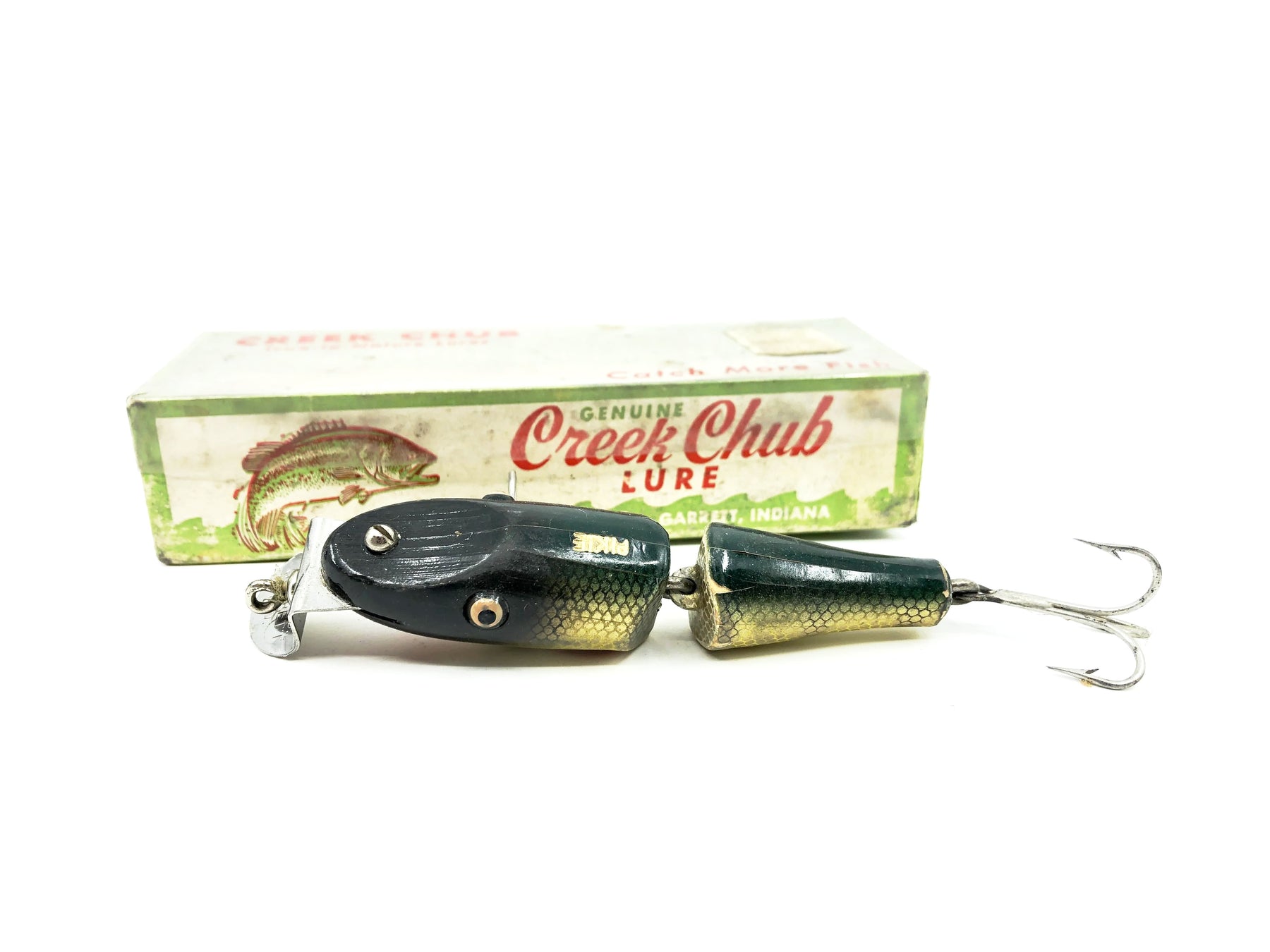 Creek Chub Baby Jointed Pikie Perch Color 2701 with 2601 Box. Nice classic lure here. About 3 1/2" long not including the lip. Lure is used with some wear but overall good condition. Wooden version of this lure. Box has some wear but still overall ok shape, see photos. Fish or collect.
