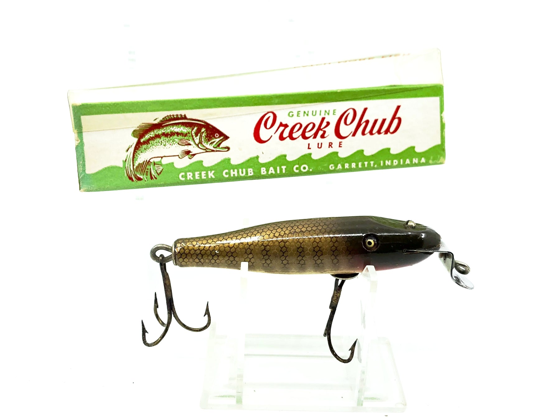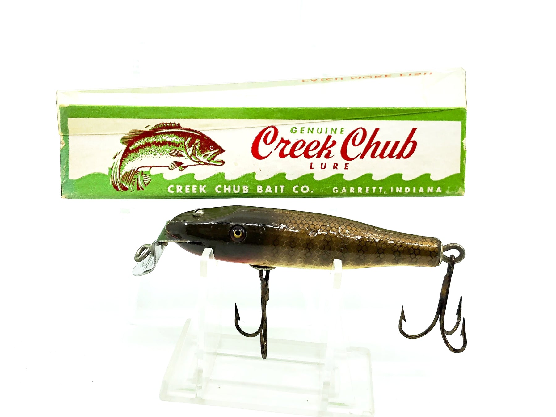 Creek Chub Baby Pikie 900 Pikie Color 900 with Box. About 3 1/4" long. Great vintage lure here. Wooden lure, glass eyes. Comes with matching box. Vintage lure is used with some minor wear and a barb cut off the front hook, but overall still in good shape. Box has some minor wear but overall in good shape. Nice matching combo. This one won't last long so grab it for your collection while you can. See photos.