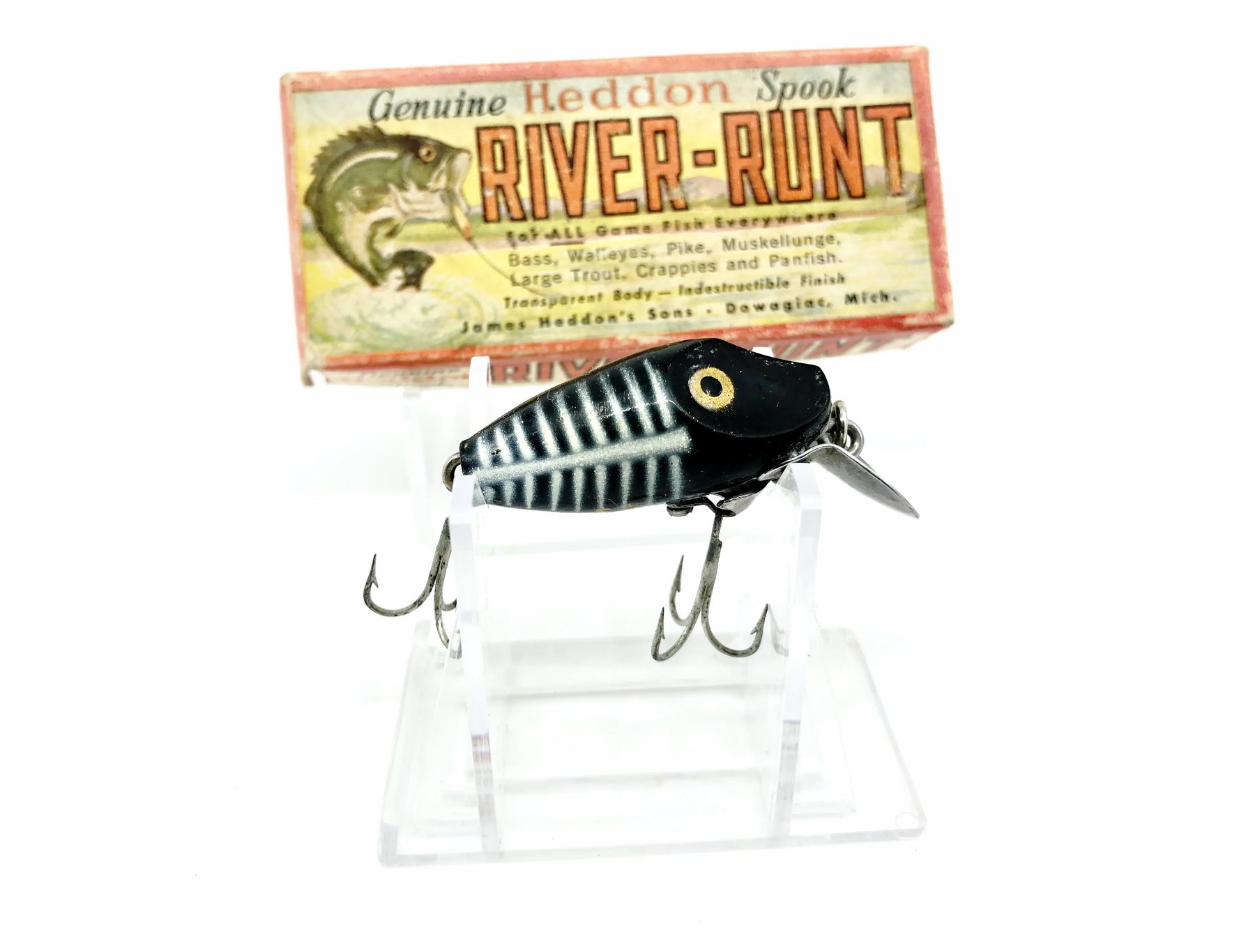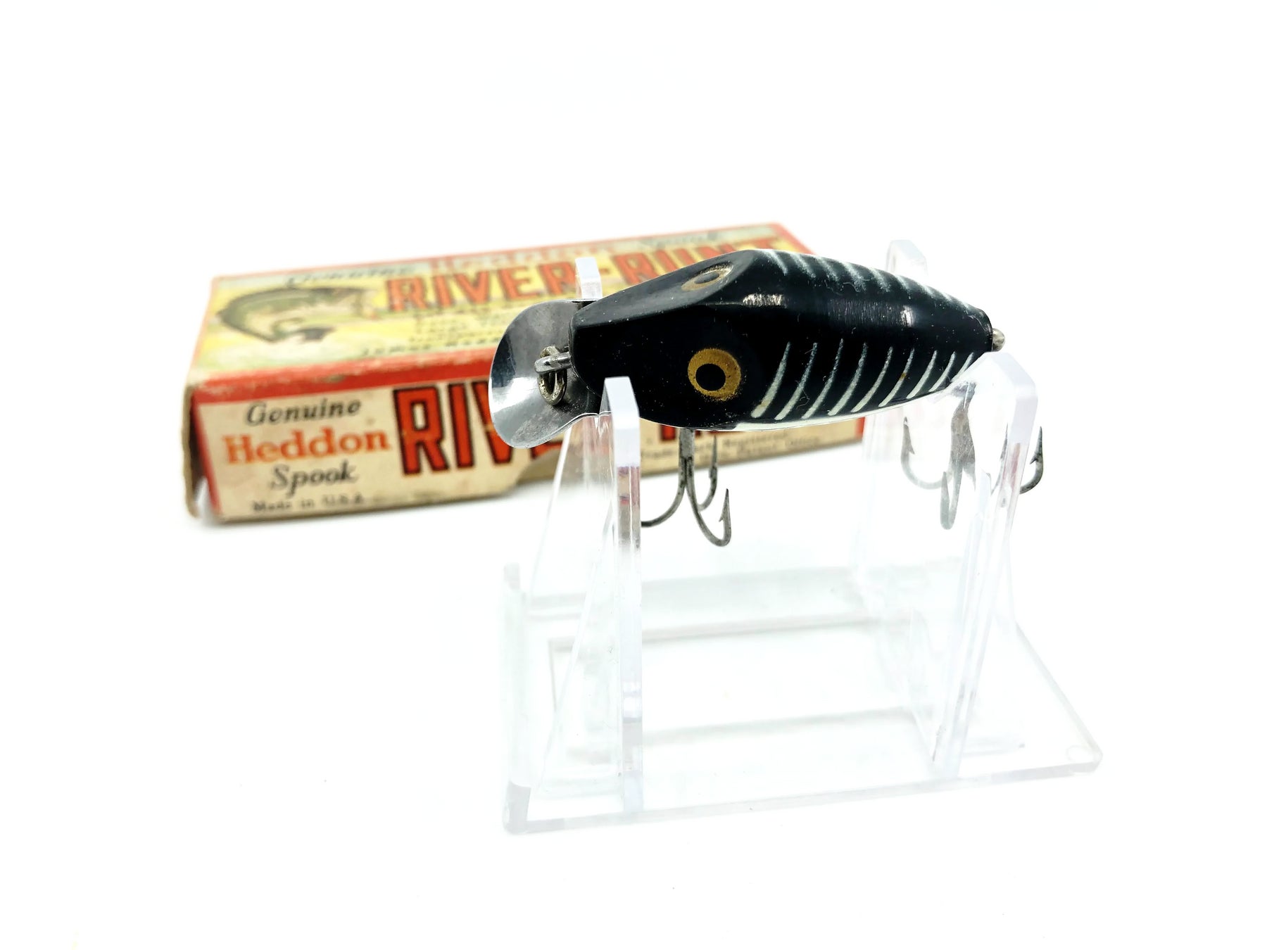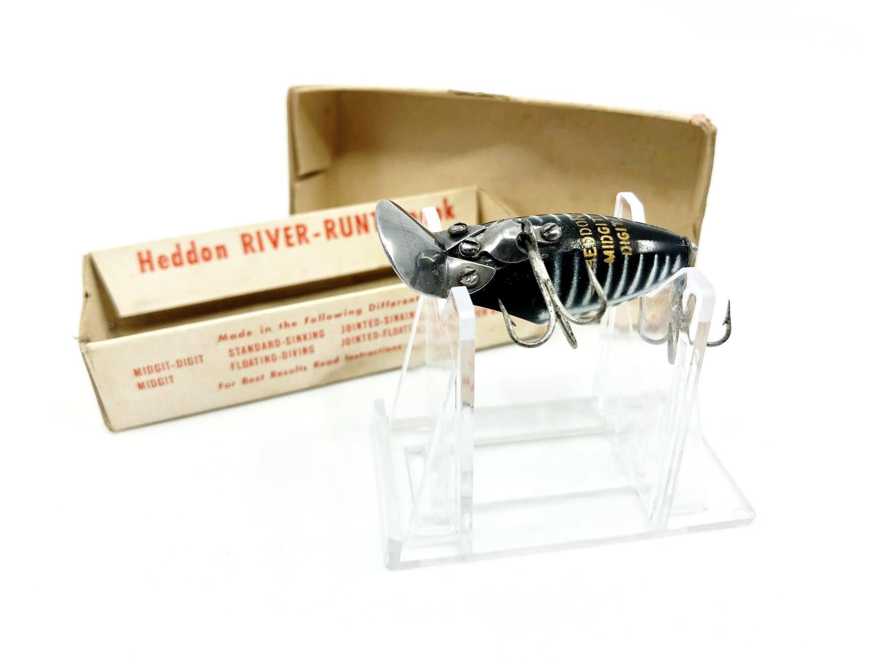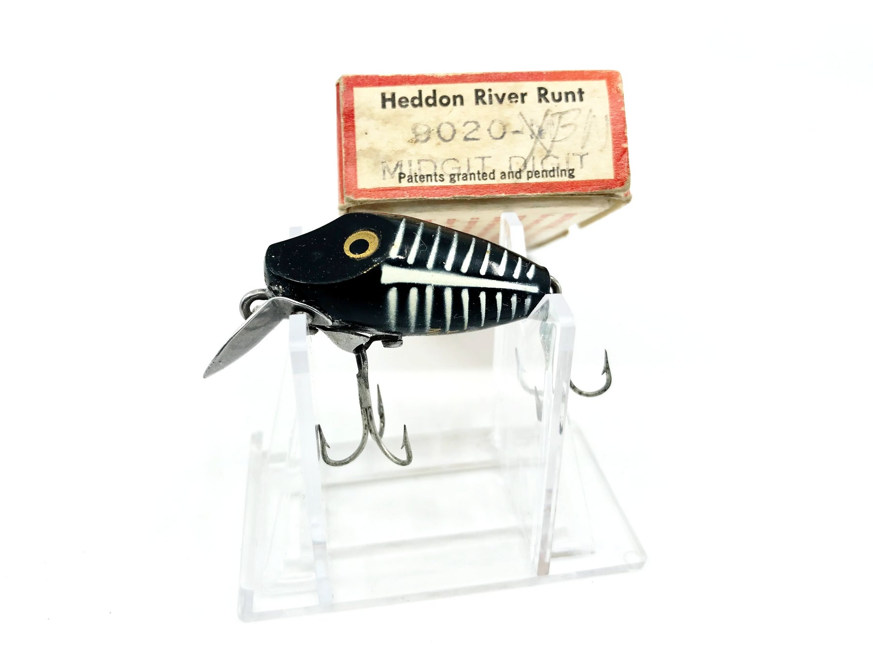 Heddon Midgit Digit River Runt 9020 XBW Black Shore Color with Box. Used lure with some minor wear but still in overall good condition. Box has wear and also some writing on the end, one end flap loose taped down inside the box. Box dates from 1946-1956. Do not believe it matches lure underneath the writing. Still a nice combo overall. See photos. One of the most iconic fishing lures of all time. Collect or fish you can't go wrong with a Heddon River Runt.