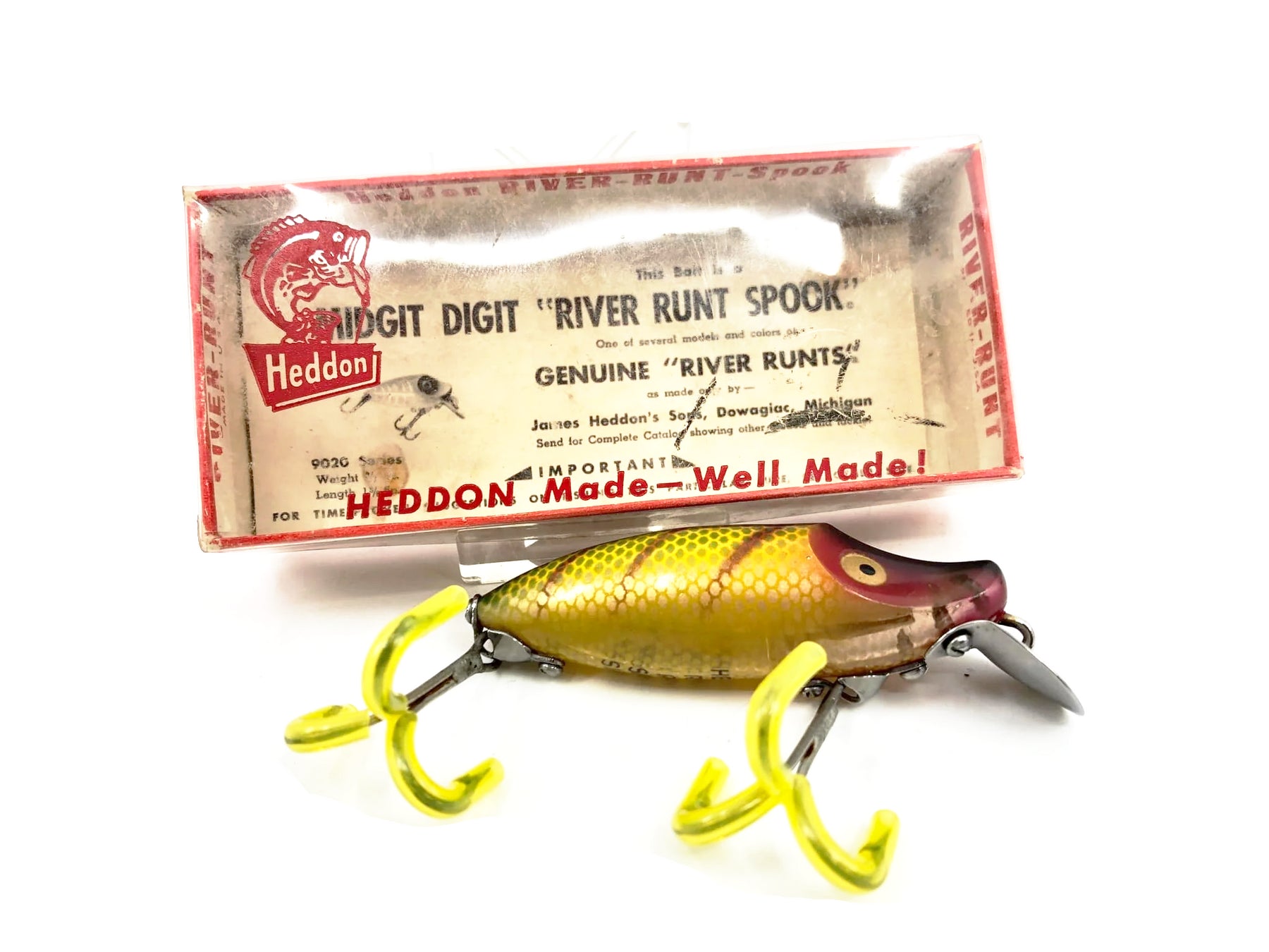 Heddon River Runt Spook Sinker Perch Color with Incorrect Box. About 2 1/2" long. Used lure with some minor wear as shown but overall good condition. Box has some minor wear but overall good condition. Box is for 9020-XRY. See photos. One of the most iconic fishing lures of all time. Collect or fish you can't go wrong with a Heddon River Runt.