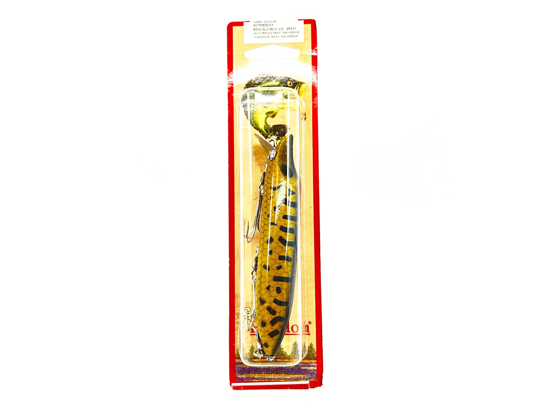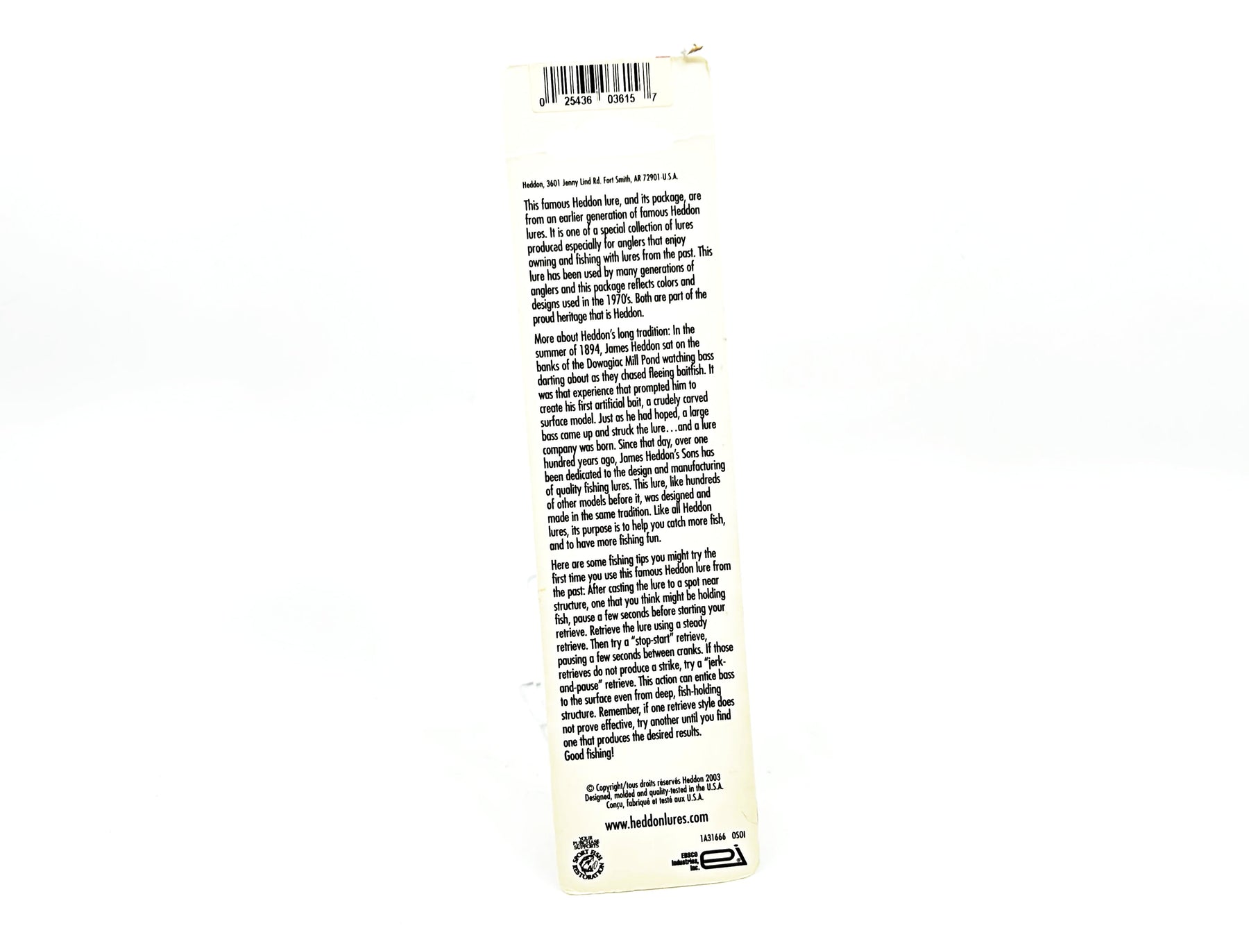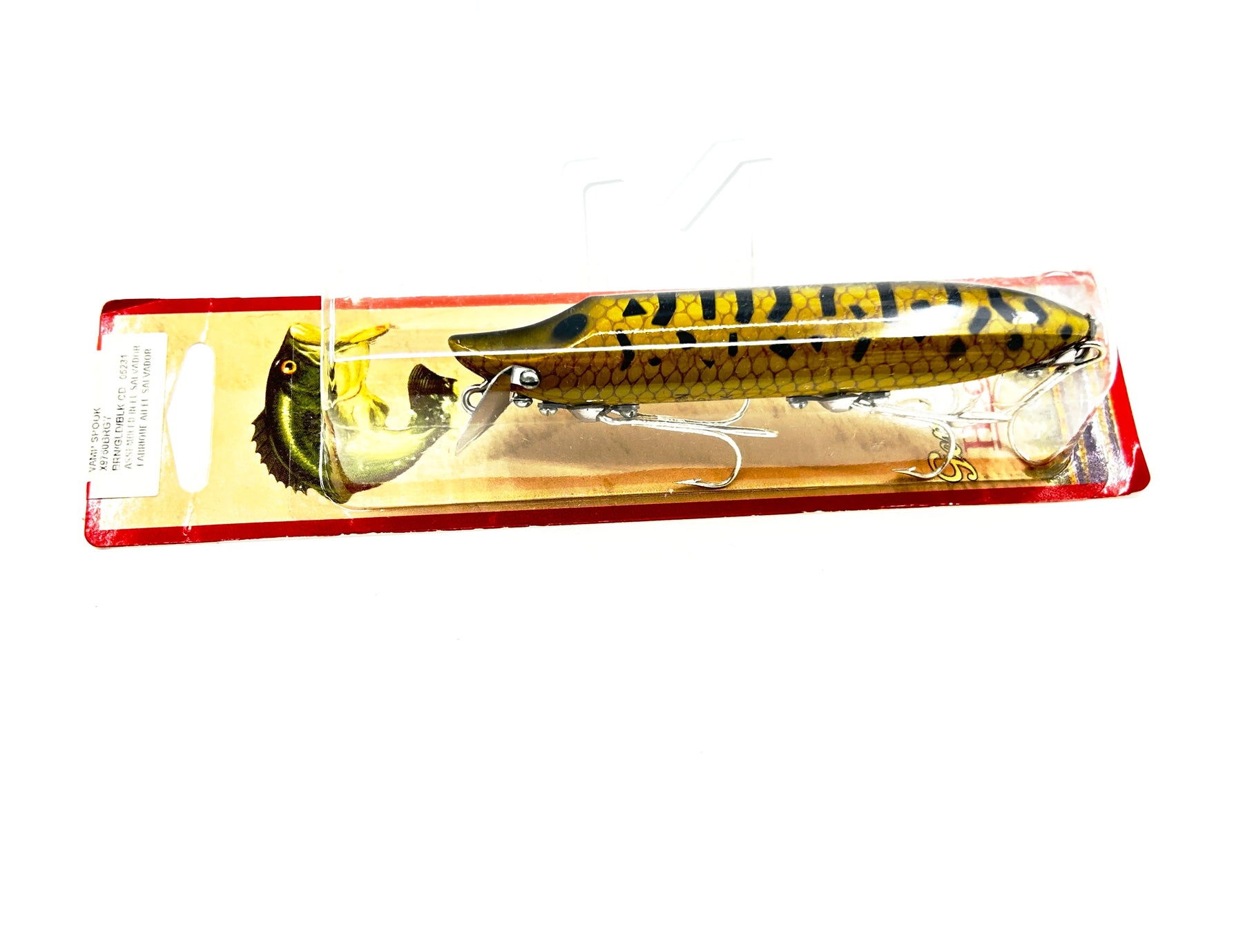 Heddon Vamp Spook BRGY-Brown/Gold/Black Coach Dog Color on Card. About 4 1/4" long. Card has some minor wear but in overall good shape. Lure new inside card. Tougher color to find. Classic Heddon bait to fish or collect. See photos. One of the best baits ever made! See photos.