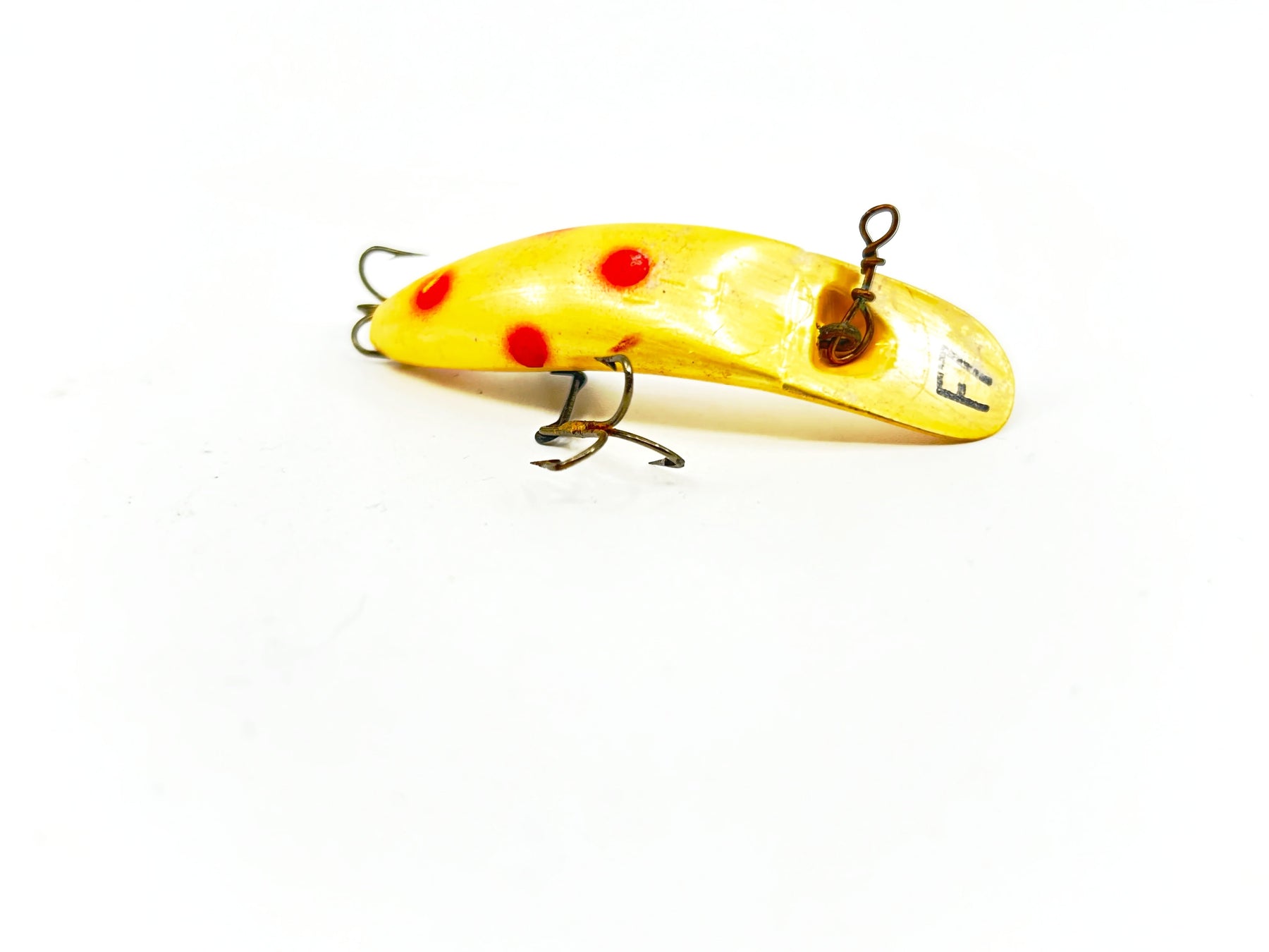 Helin Flatfish F7, Pearl with Spots Color. About 2 1/4" long. Used with wear but overall in good condition, see photos. One of the most successful fishing lures ever made. Fish or collect! Vintage plastic version.