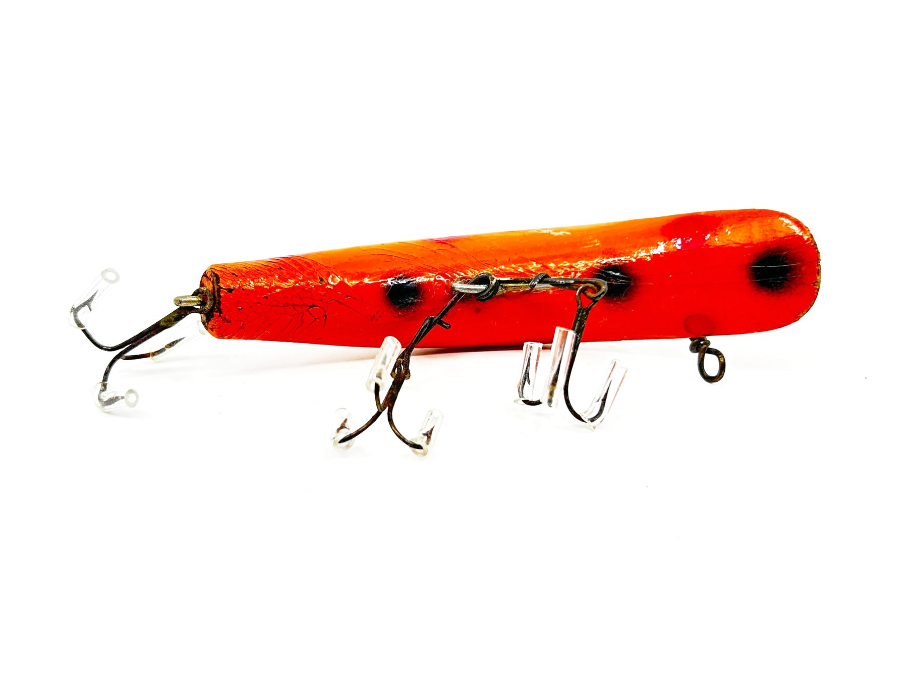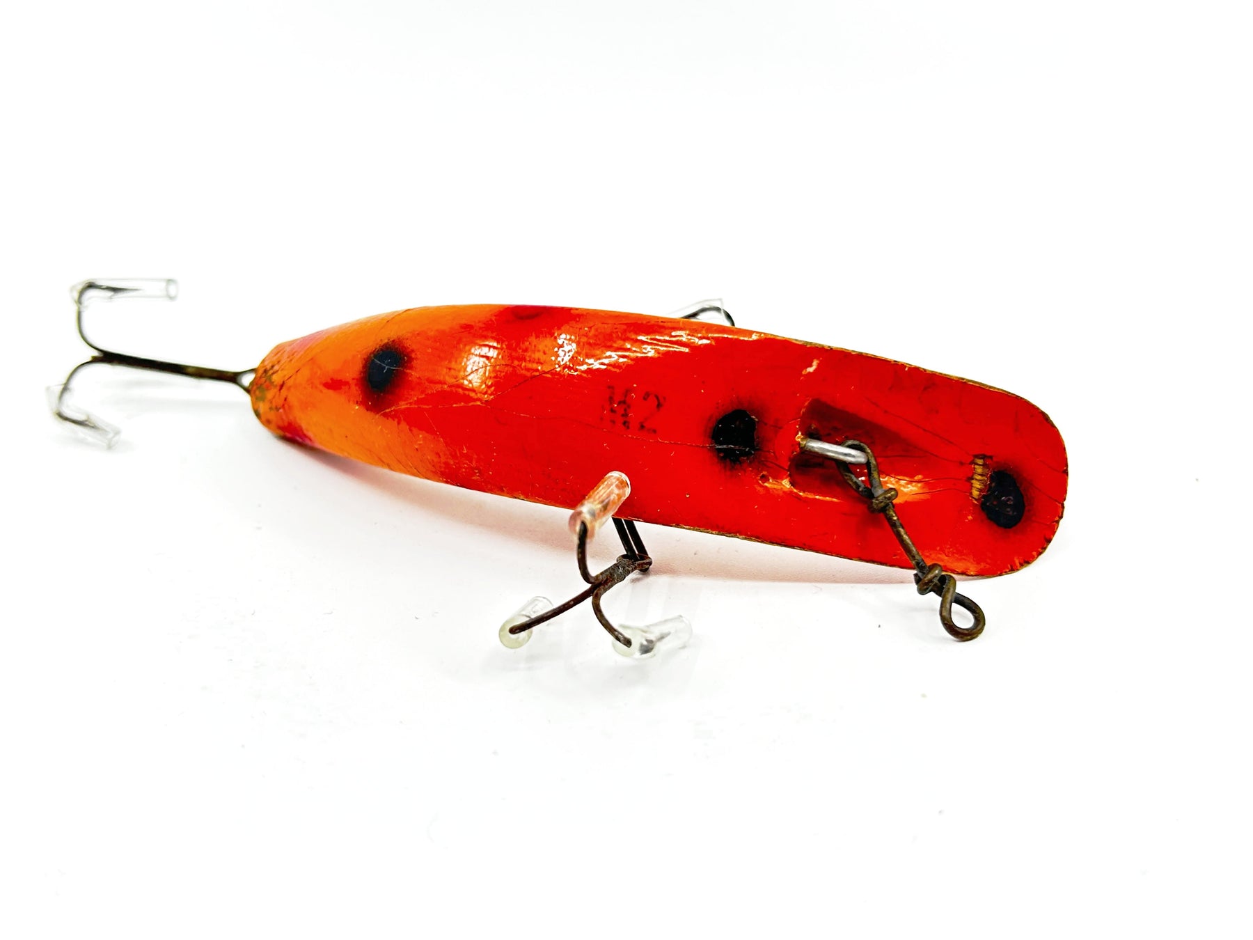 Helin Flatfish M2, Orange with Spots Color-Wooden. About 4 1/4" long. Used with some wear but overall good condition, see photos. One of the most successful fishing lures ever made. Fish or collect! Vintage wooden version.