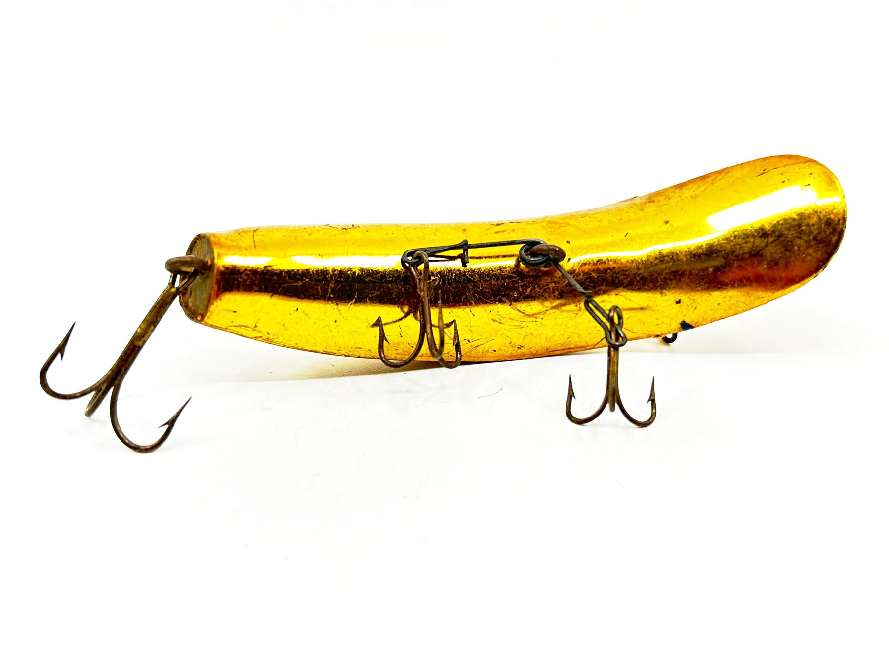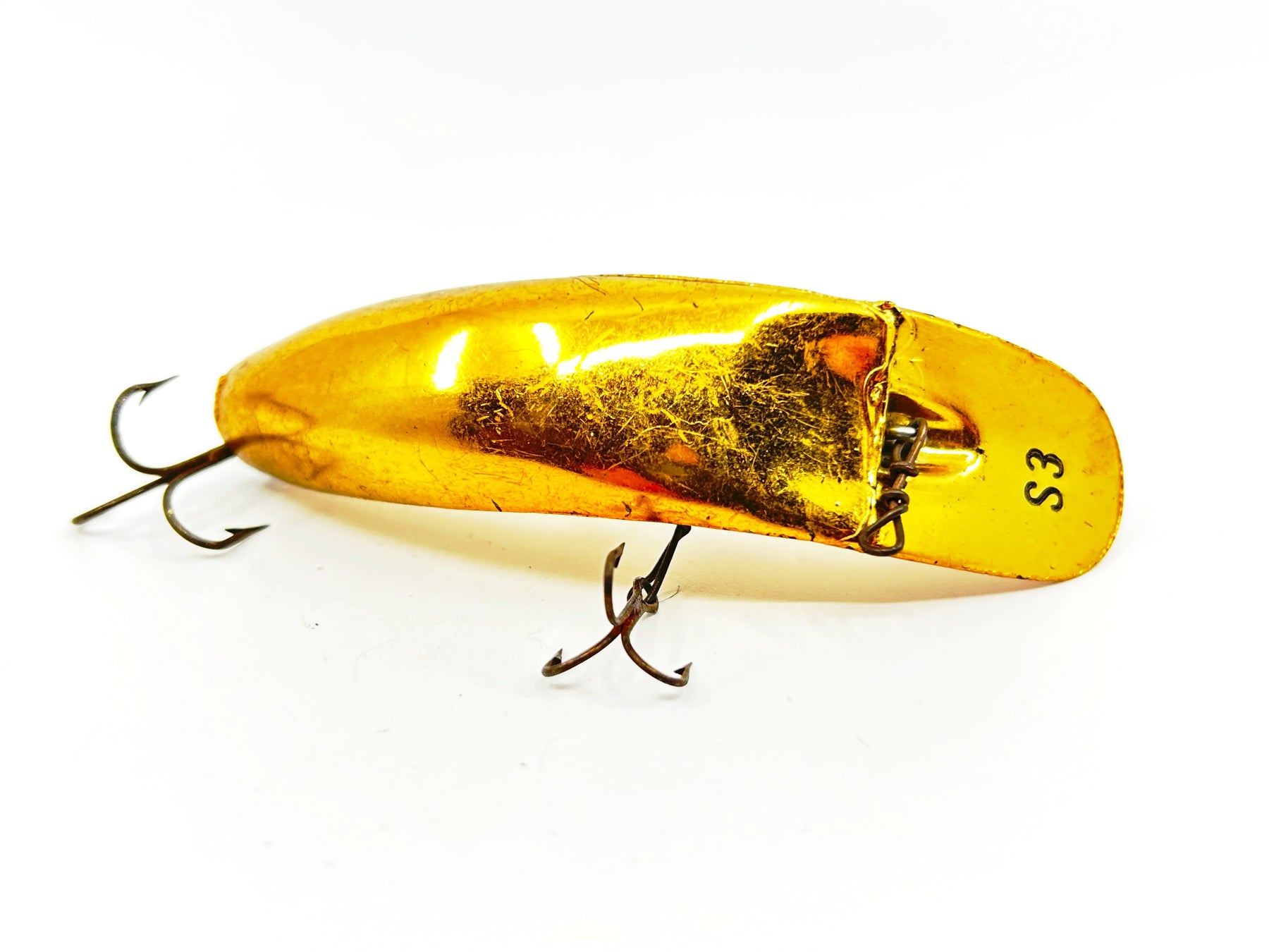 Helin Flatfish S3, Gold Plated Color. About 3 1/2" long. Used with some wear but overall in good condition, see photos. One of the most successful fishing lures ever made. Fish or collect! Vintage plastic version.
