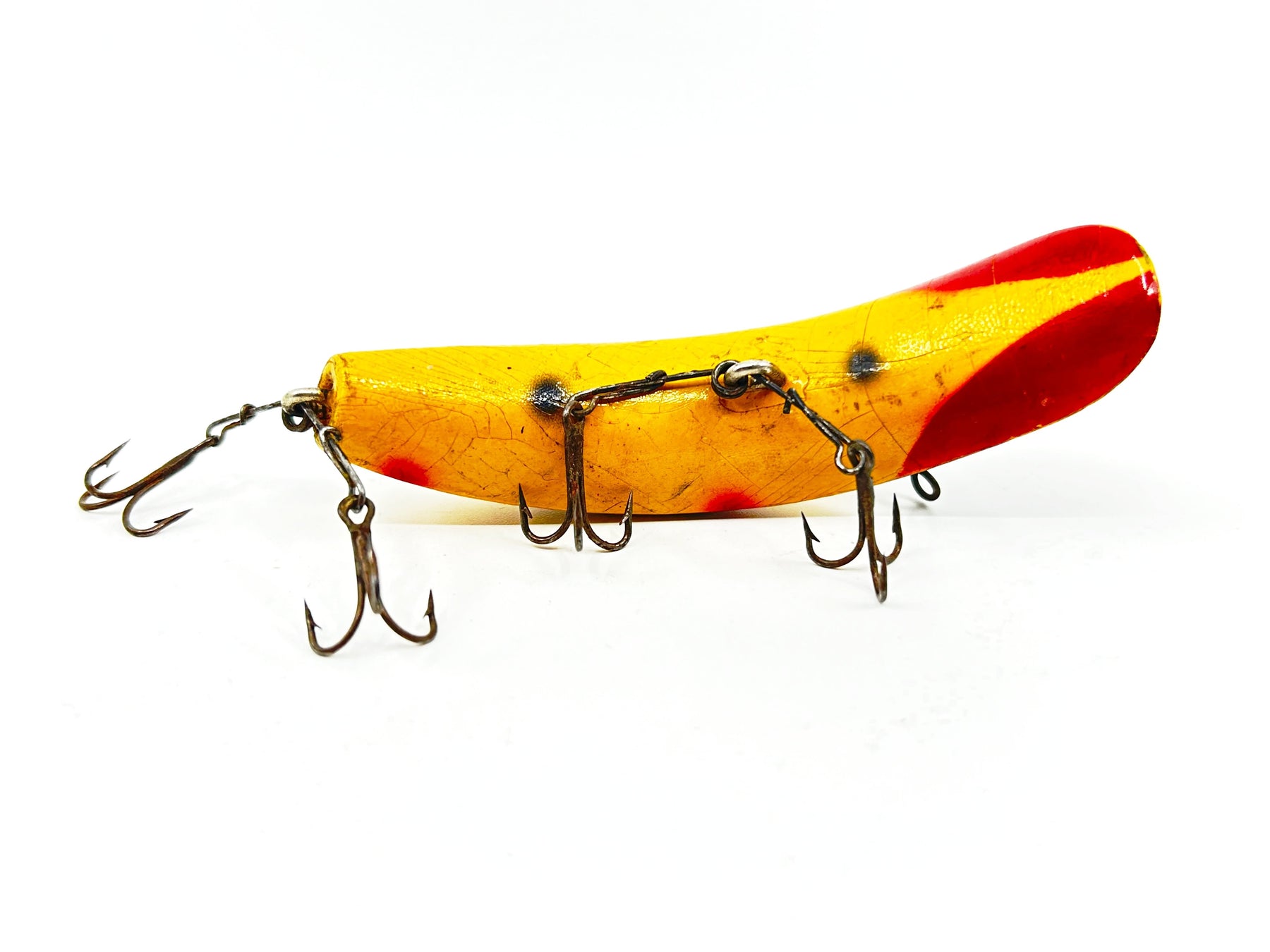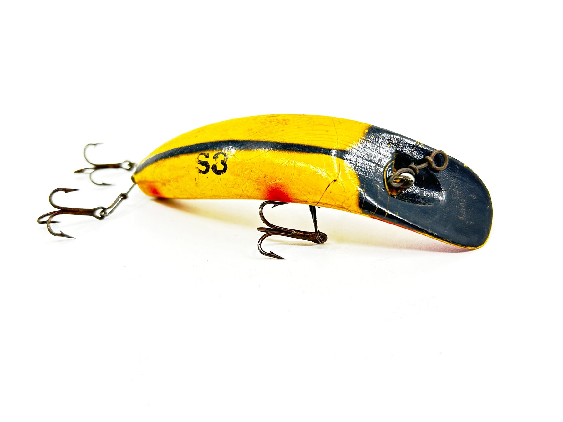 Helin Flatfish S3, Yellow with Black Stripe and Spots Color-Wooden. About 3 1/2" long. Used with some wear but overall good condition, see photos. One of the most successful fishing lures ever made. Fish or collect! Vintage wooden version.