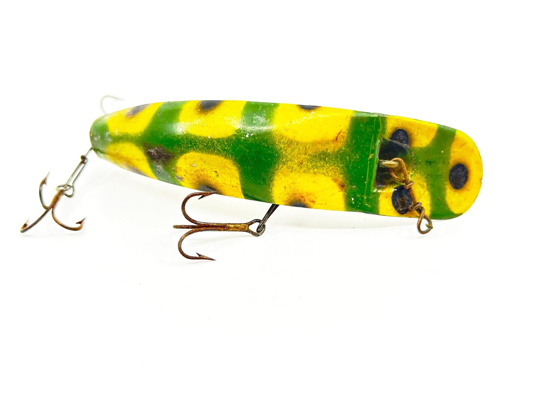 Helin Flatfish T4, Frog Color.  About 3 1/2" long.  Used with some wear but still overall in good condition, may clean up better, see photos. One of the most successful fishing lures ever made.  Fish or collect!  Vintage plastic version.