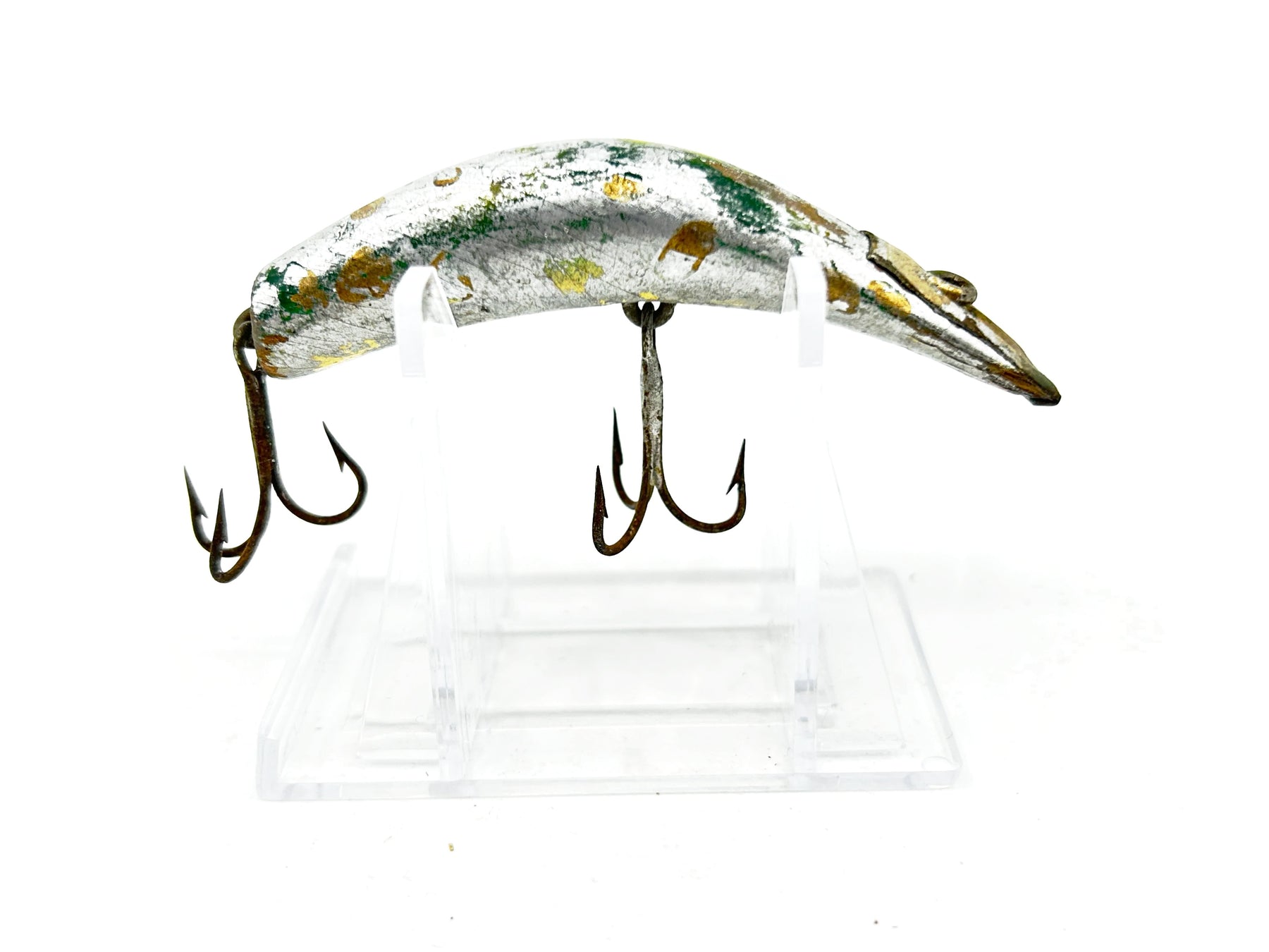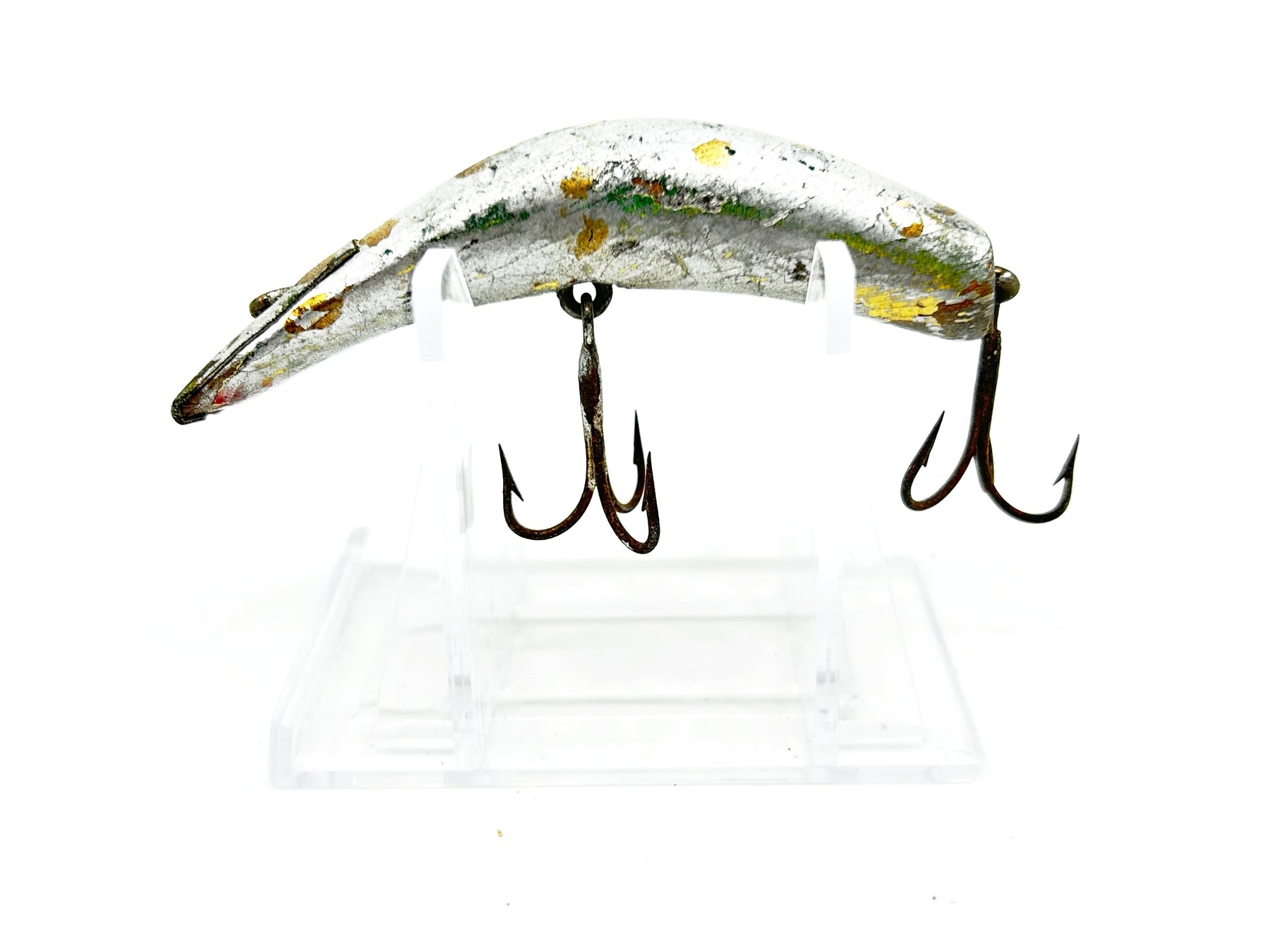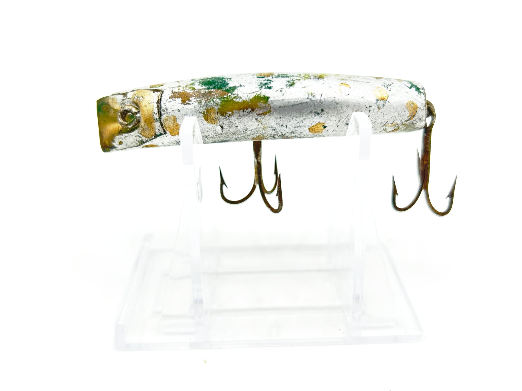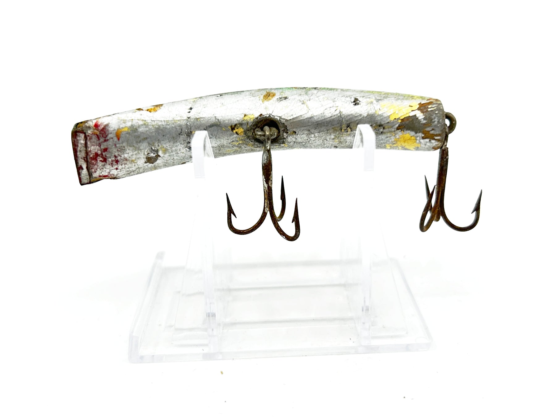 Lazy Ike 3 Repainted Wooden Warrior. About 3" long. Used with wear and overpainted in silver but overall in fair condition. See photos. Great classic lure here. Give some TLC and take fishing.