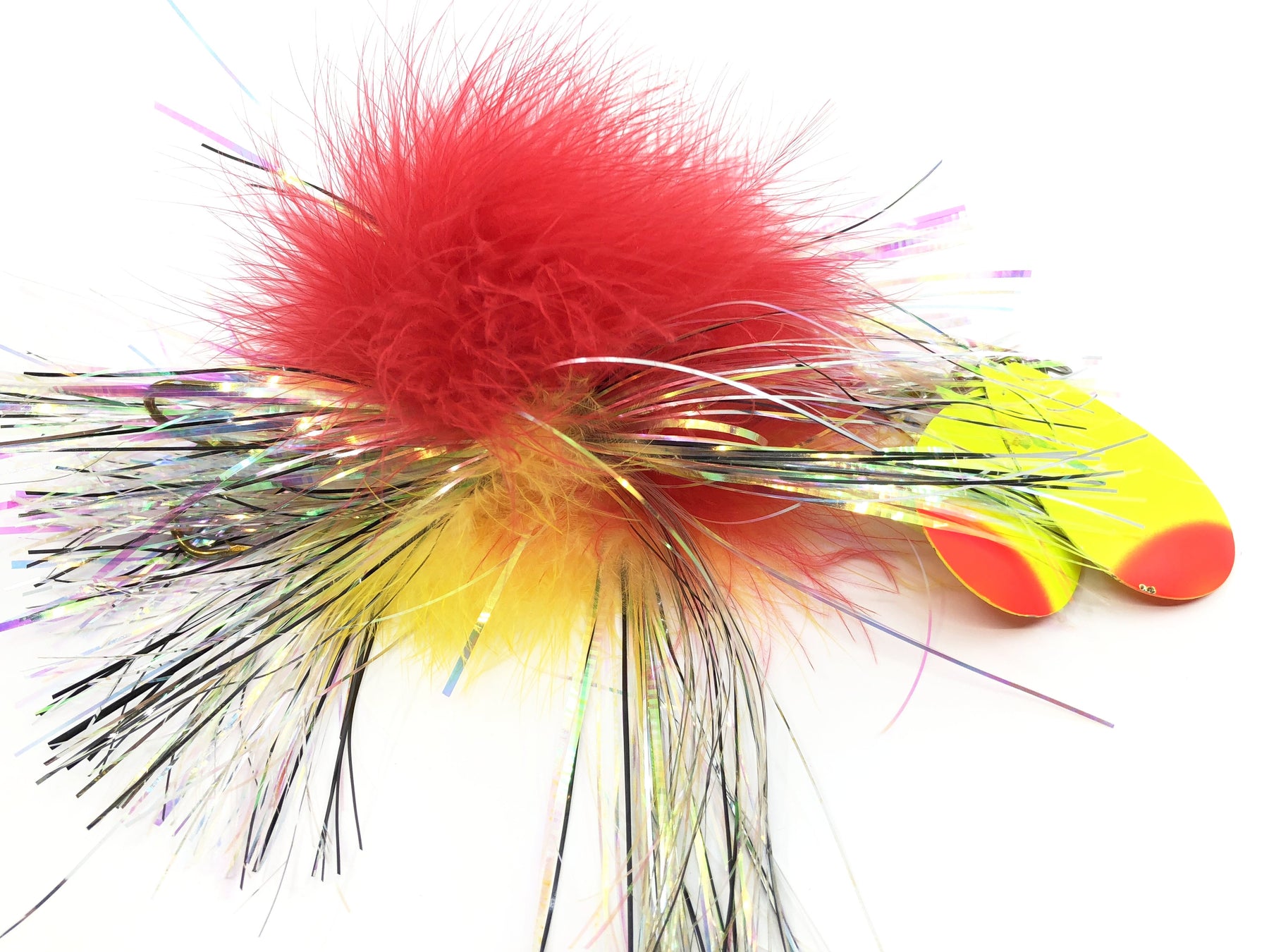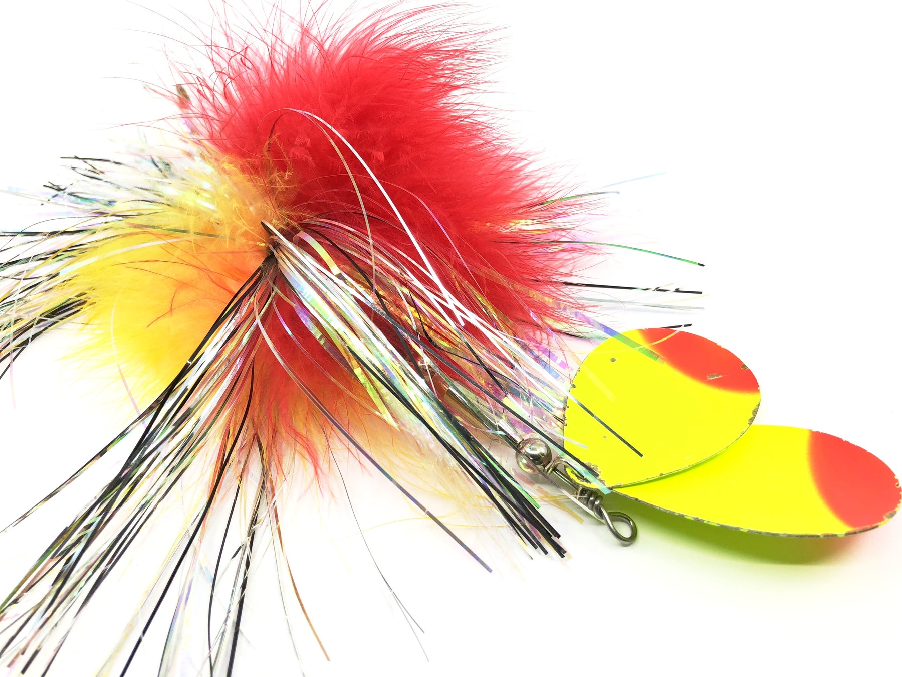 Tandem Blade Musky Spinner Great Lure.  About 8" long.  Fresh from a musky tackle box.  Appears unfished.  Not sure of maker but darn nice, some minor paint wear on blades.  See photos.
