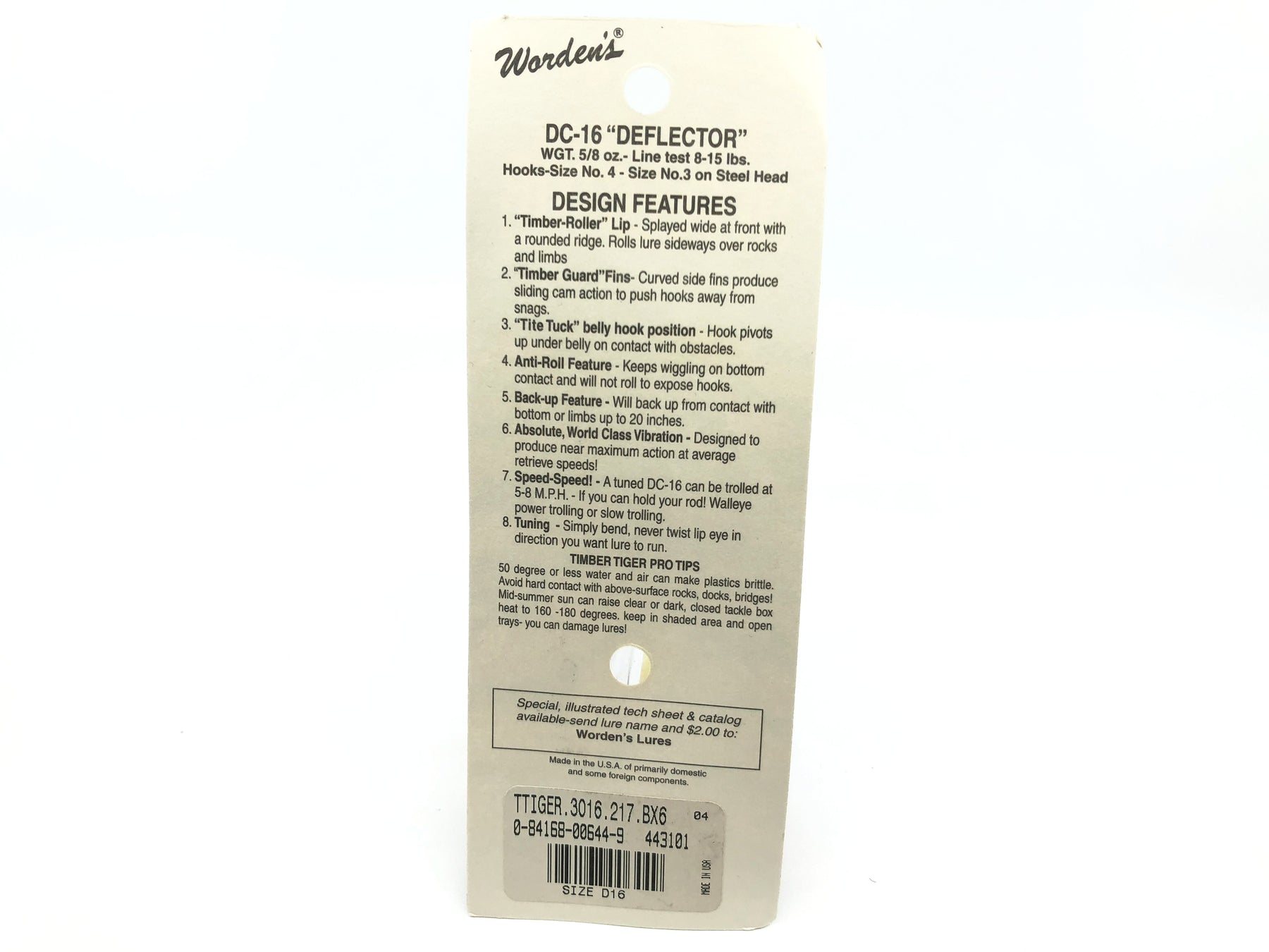 Worden Timber Tiger Deflector DC-16 Color 217 Green Back Chartreuse. TTIGER.3016.217.BX6 New old stock. Nice lure here new on card. Card has some minor wear but lure new on card.