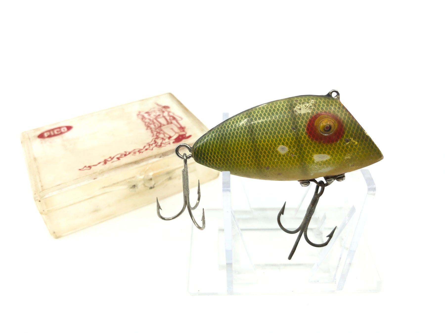 PICO Perch New in Box Perch Scale Color.  Great vintage lure here.  About 2 1/4" long.  Comes with box and box insert.  Box is in ok condition.  Lure has some wear but still ok shape, see photos.  Great one to add to your collection or tackle box.