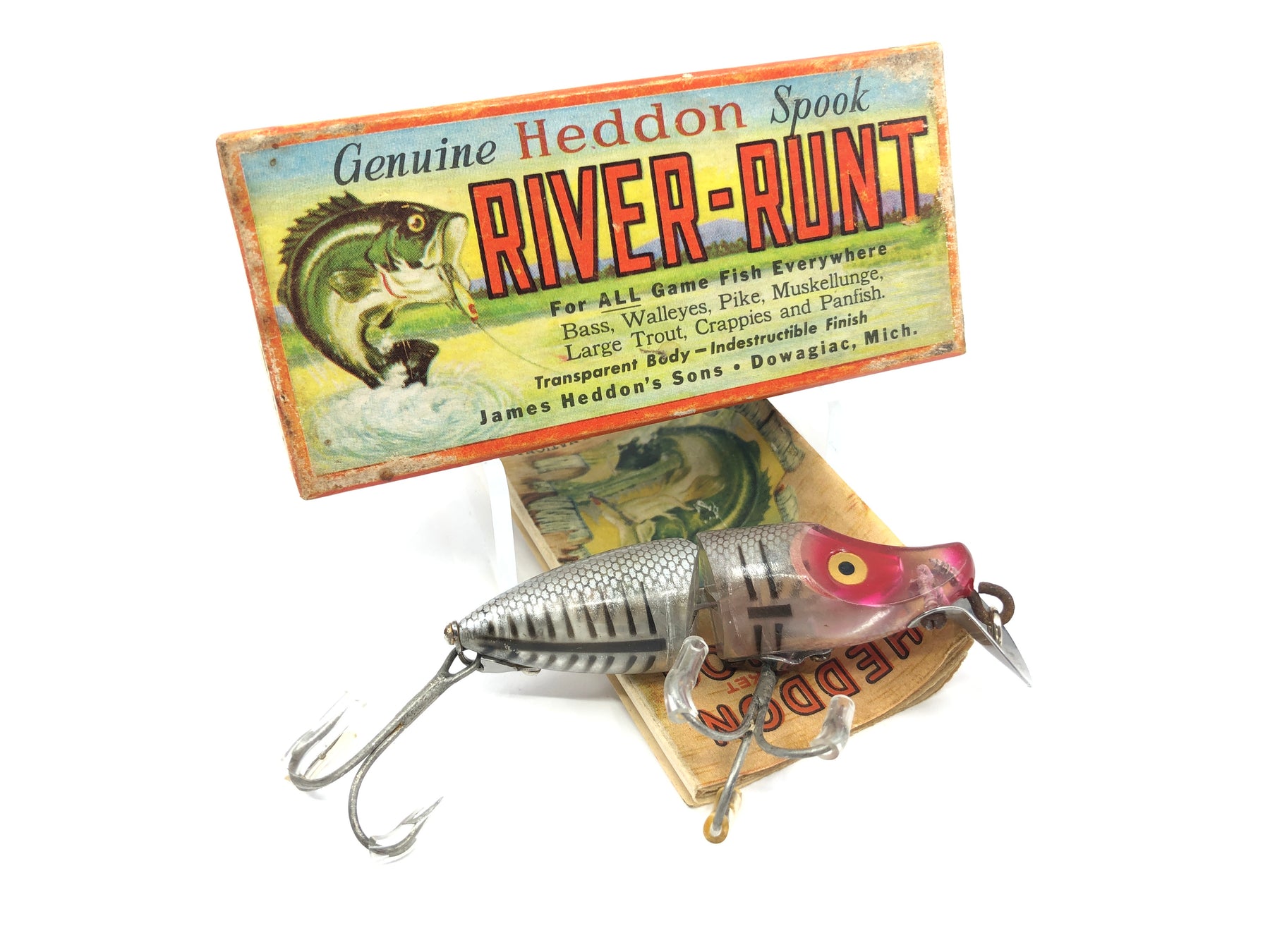 Heddon Jointed River Runt 9330 XRS Silver Shore Minnow Color with Box and Catalog. Box and catalog in nice shape as is lure. Tougher combo to find on a tougher jointed River Runt model. The box dates from 1946-1956. Great matching combo here. Will make a great addition to your collection.