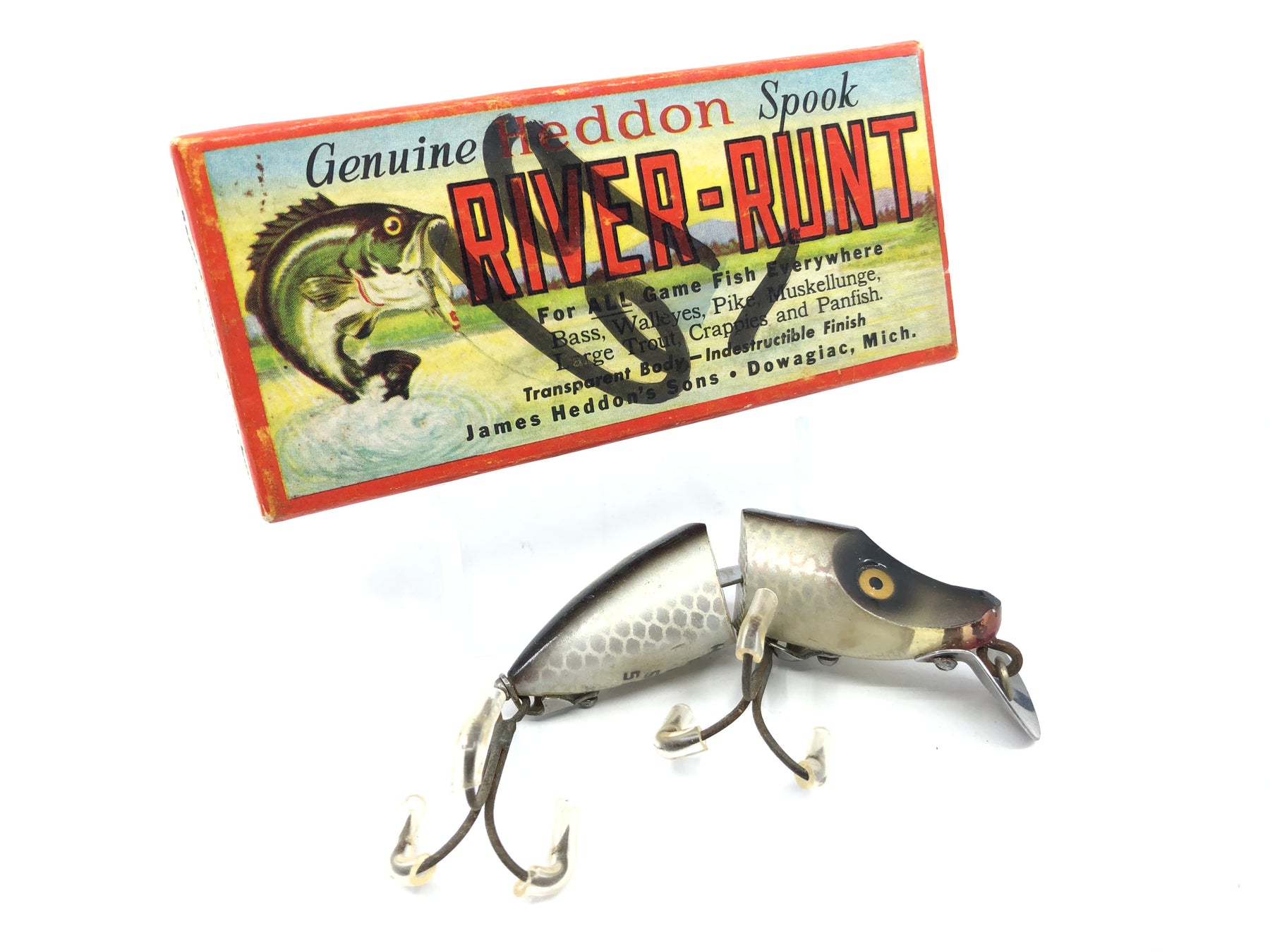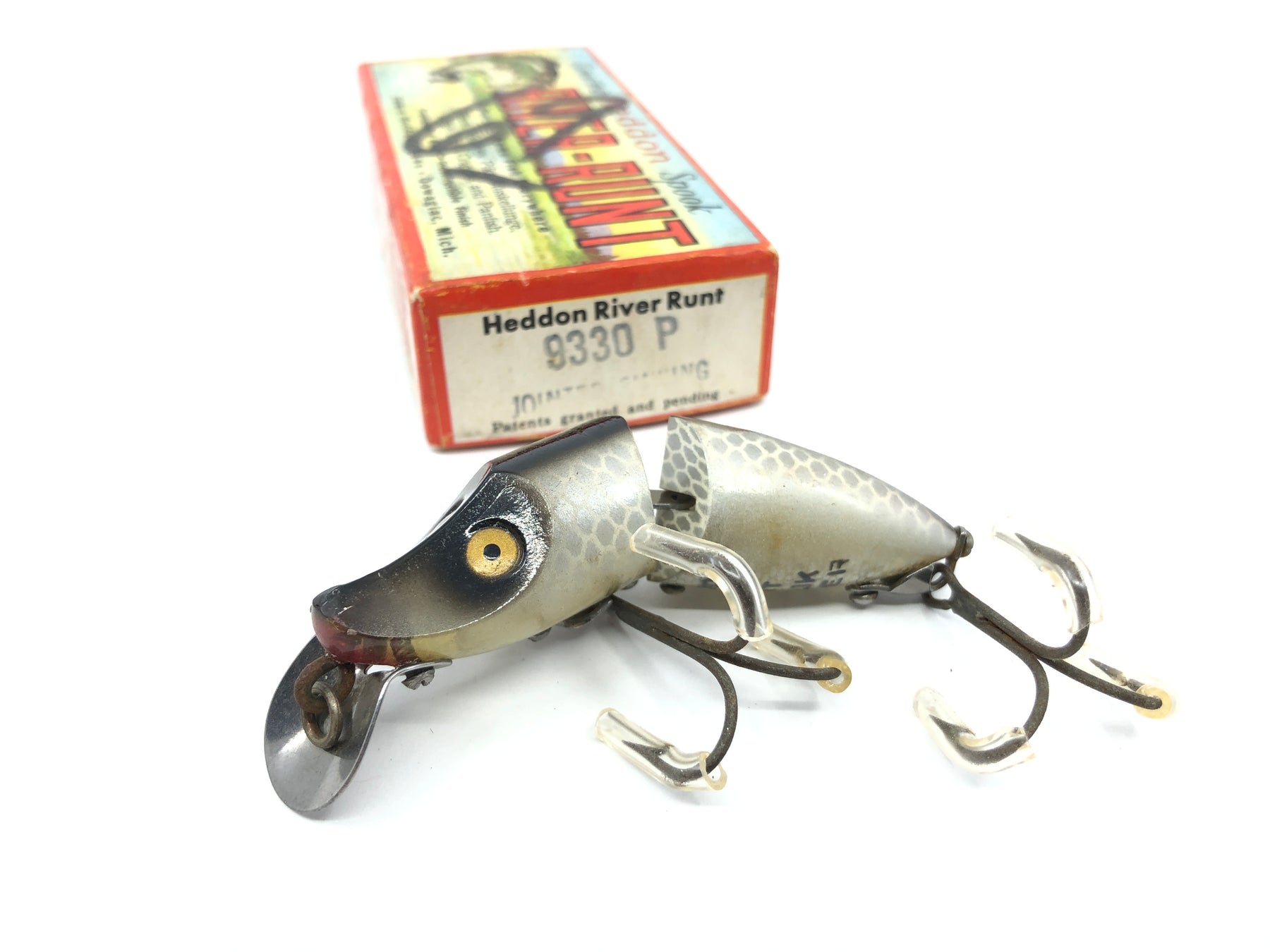 Heddon Jointed Sinking River Runt 9330 P Shiner Scale Color with Box. Box has some minor wear but still in good shape as is lure. Tougher combo to find on a tougher jointed River Runt model. The box dates from 1946-1956. Great matching combo here. Will make a great addition to your collection.