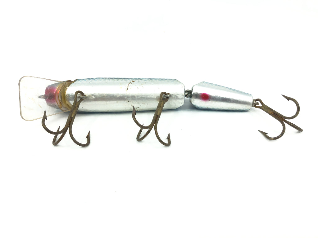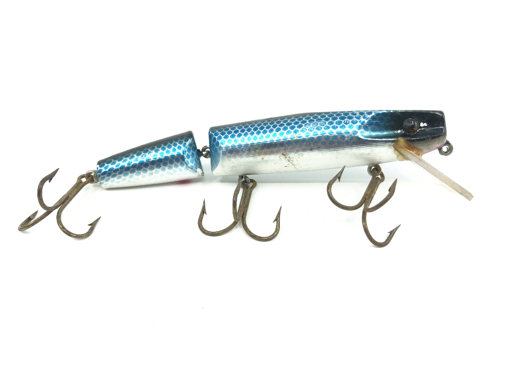 Wiley 6 1/2" Jointed Musky King Jr. in Blue Scale Silver Shiner Color. About 6" body, 6 1/2" including lip. Tough to find older discontinued model and color. Used vintage bait here. One of the best musky lures every made. Highly sought after by both fisherman and collectors. This lure is used with some wear as shown in the photos but overall good condition and still has plenty of life left to fish (would recommend new hooks) or would look great in your collection. See photos.