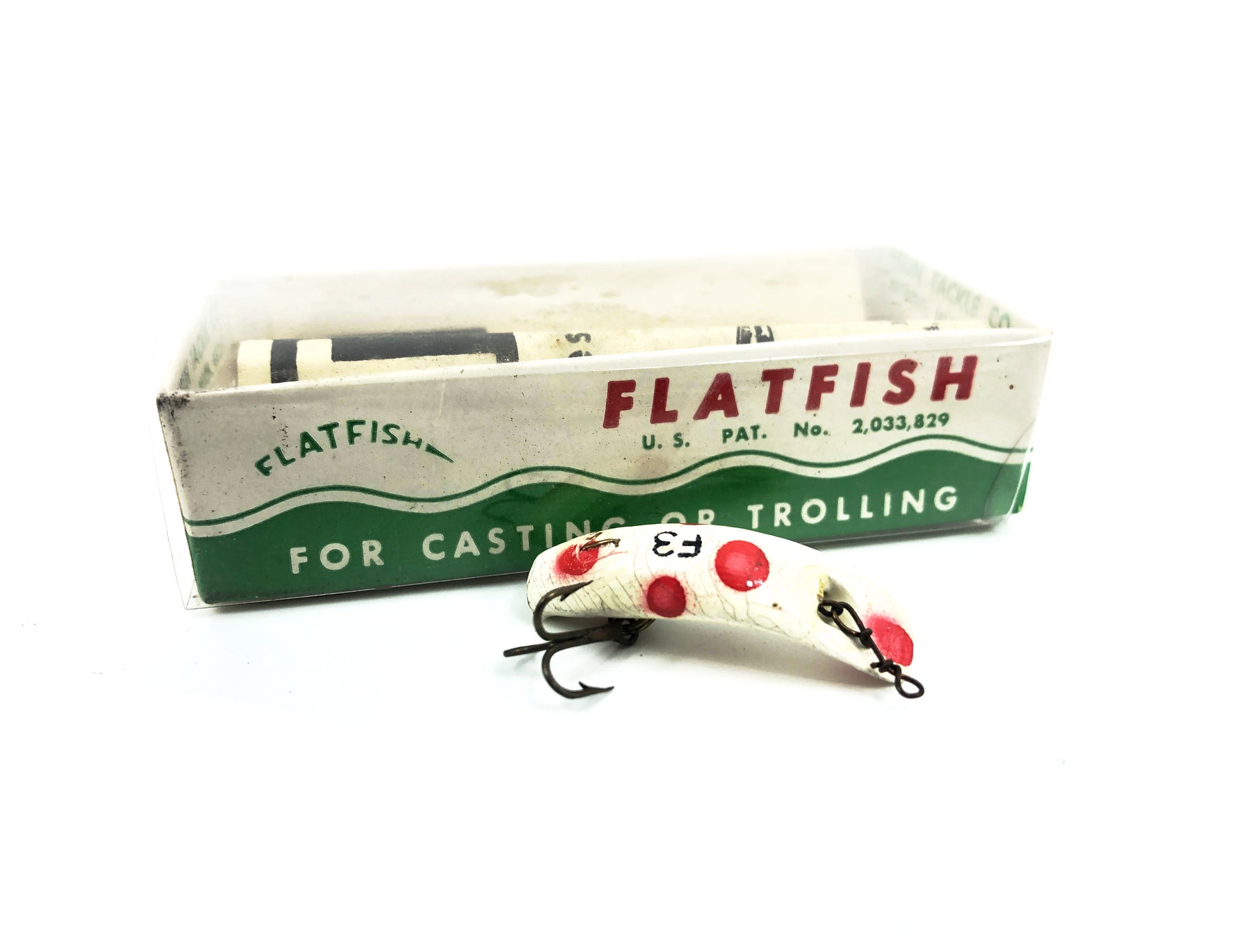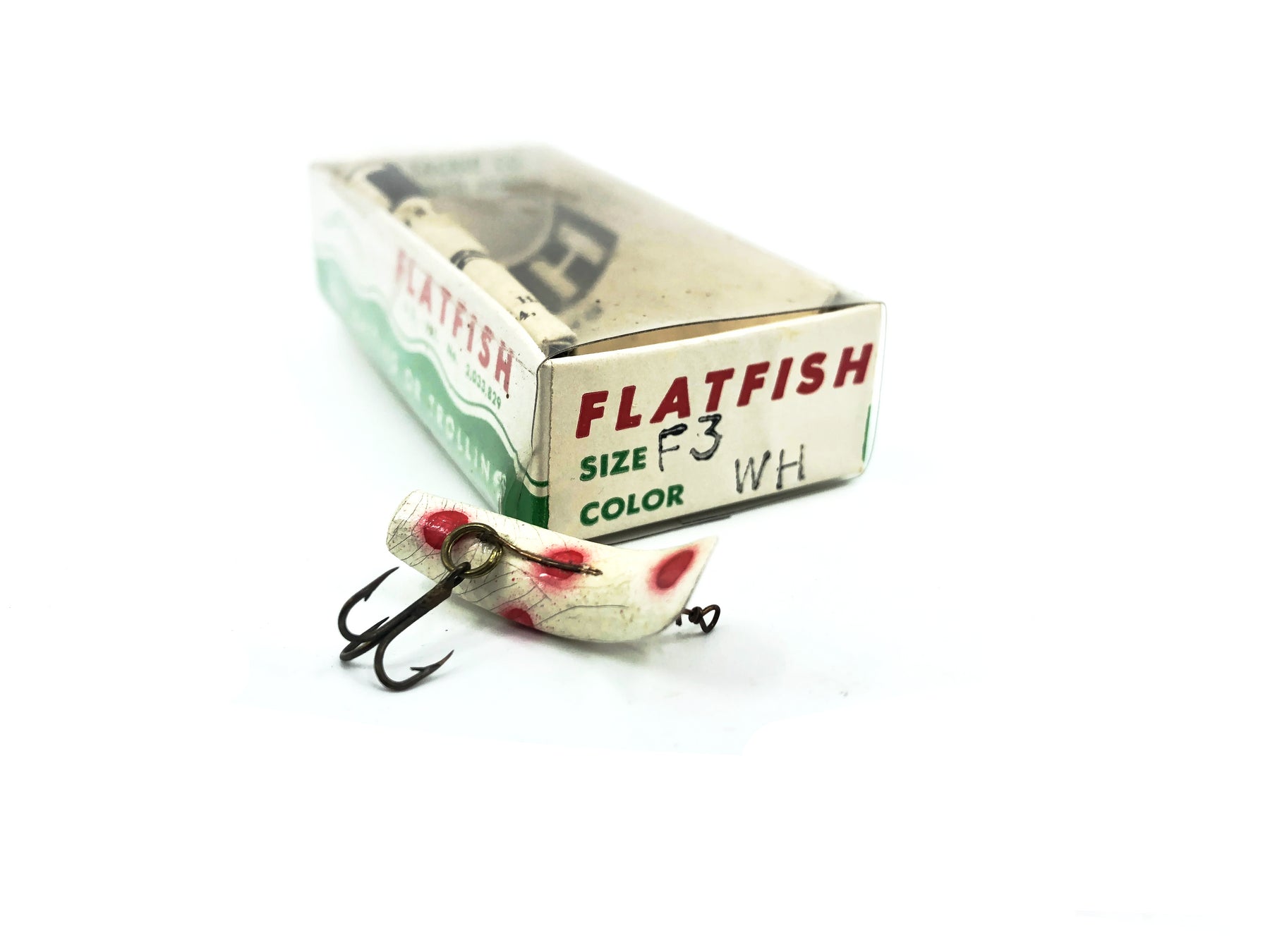 Vintage Helin Flatfish F3, WH White/Red Spots Color with Box. Lure is about 1 1/4" long. Lure has some minor wear and marks from storage. Matching box has some minor wear as well but is in overall good condition. Vintage wooden version. See photos.